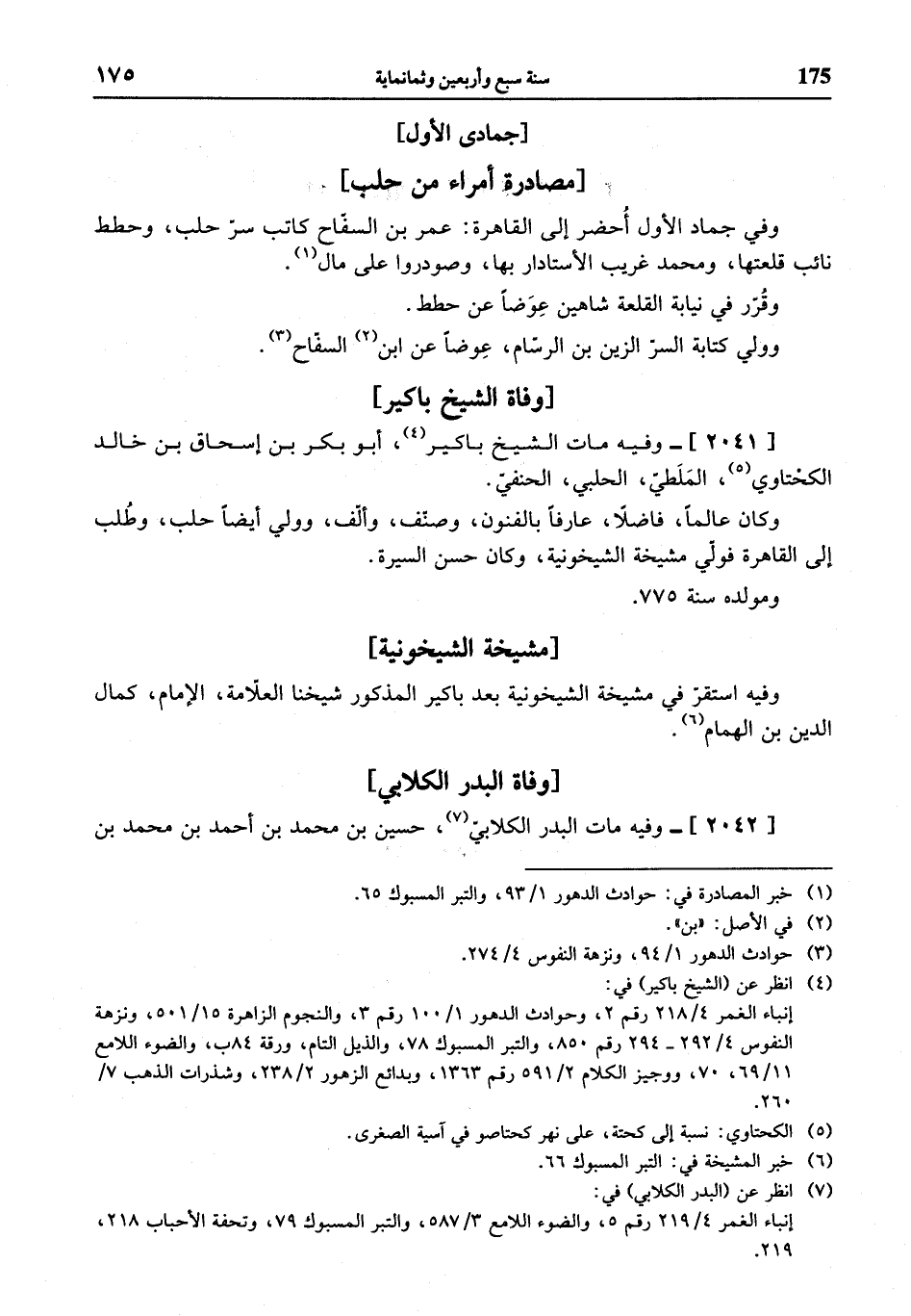 (¬4) انظر عن (الشيخ باكير) في: إنباء الغمر 4/ 218 رقم 2، وحوادث الدهور 1/ 100 رقم 3، والنجوم الزاهرة 15/ 501، ونزهة النفوس 4/ 292 - 294 رقم 850، والتبر المسبوك 78، والذيل التام، ورقة 84 ب، والضوء اللامع 11/ 69، 70، ووجيز الكلام 2/ 591 رقم 1363، وبدائع الزهور 2/ 238، وشذرات الذهب 7/ 260.