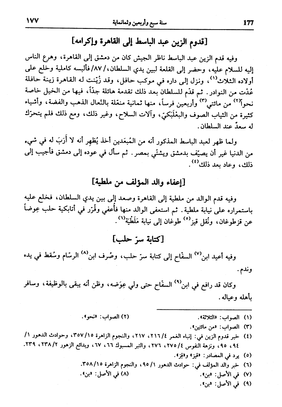 وفيه قدم الزين عبد الباسط ناظر الجيش كان من دمشق إلى القاهرة، وهرع الناس إليه للسلام عليه، وحضر إلى القلعة لبين يدي السلطان، / 87 / فألبسه كاملية وخلع على أولاده الثلاث (¬1)، ونزل إلى داره في موكب حافل، وقد زيّنت له القاهرة زينة حافلة عدّت من النوادر. ثم قدّم للسلطان بعد ذلك تقدمة هائلة جدّا، فيها من الخيل خاصة نحوا (¬2) من مائتي (¬3) وأربعين فرسا، منها ثمانية منغلة بالنّعال الذهب والفضة، وأشياء كثيرة من الثياب الصوف والبعلبكيّ، وآلات السلاح، وغير ذلك، ومع ذلك فلم يتحرّك له سعد عند السلطان.