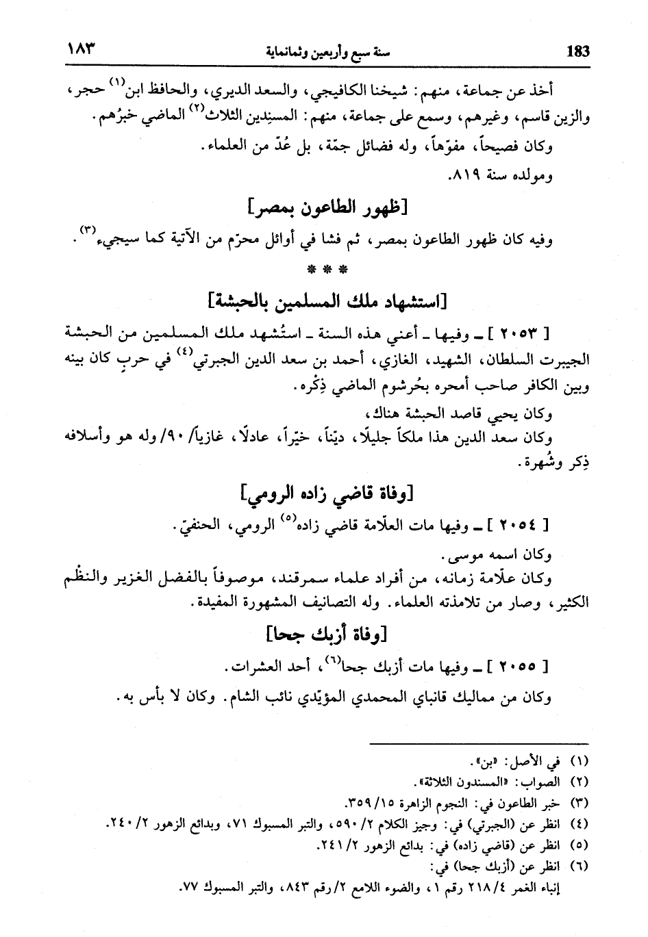 [2053]- وفيها - أعني هذه السنة - استشهد ملك المسلمين من الحبشة الجيبرت السلطان، الشهيد، الغازي، أحمد بن سعد الدين الجبرتي (¬4) في حرب كان بينه وبين الكافر صاحب أمحره بحرشوم الماضي ذكره.