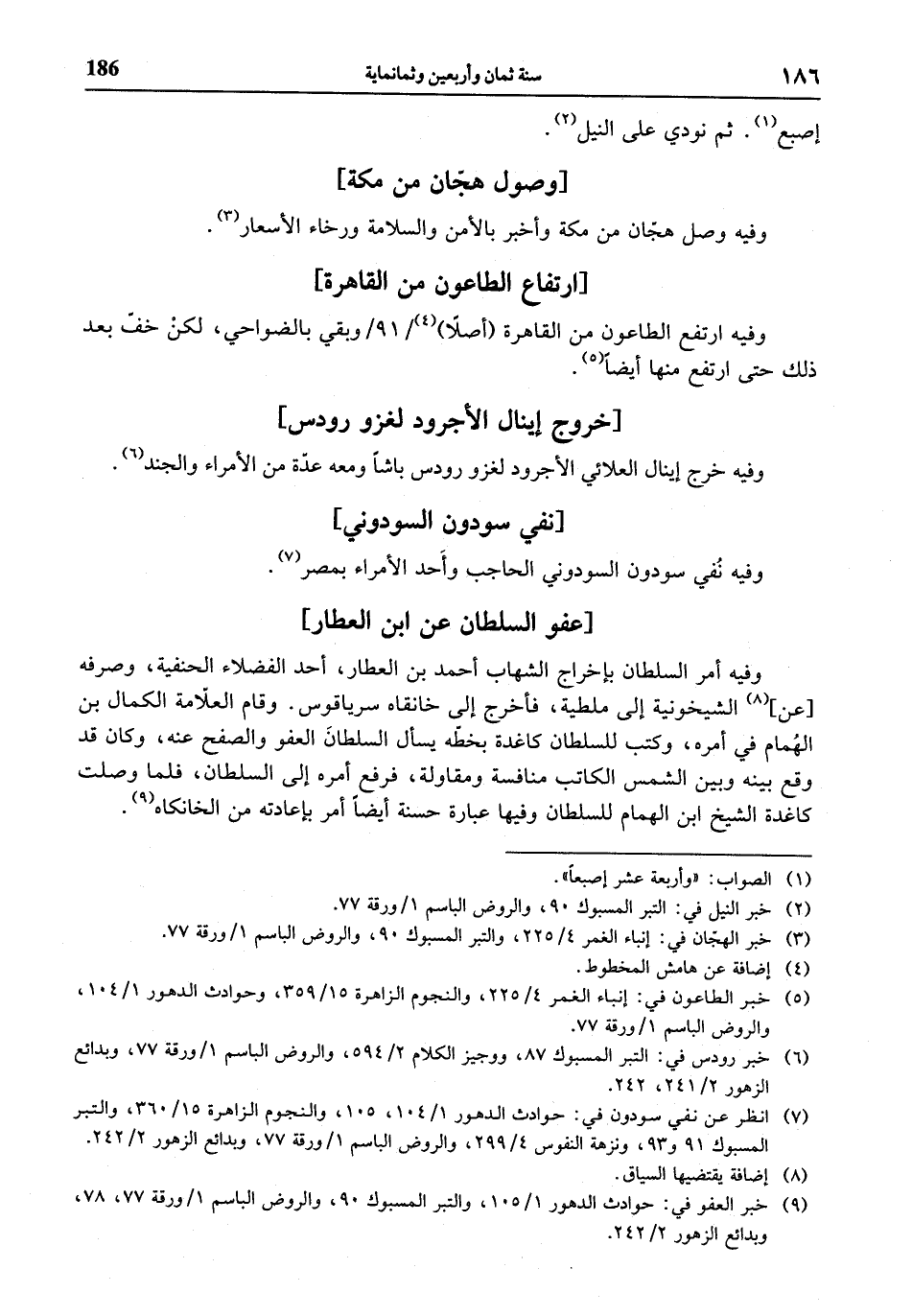 (¬9) خبر العفو في: حوادث الدهور 1/ 105، والتبر المسبوك 90، والروض الباسم 1 / ورقة 77، 78، وبدائع الزهور 2/ 242.