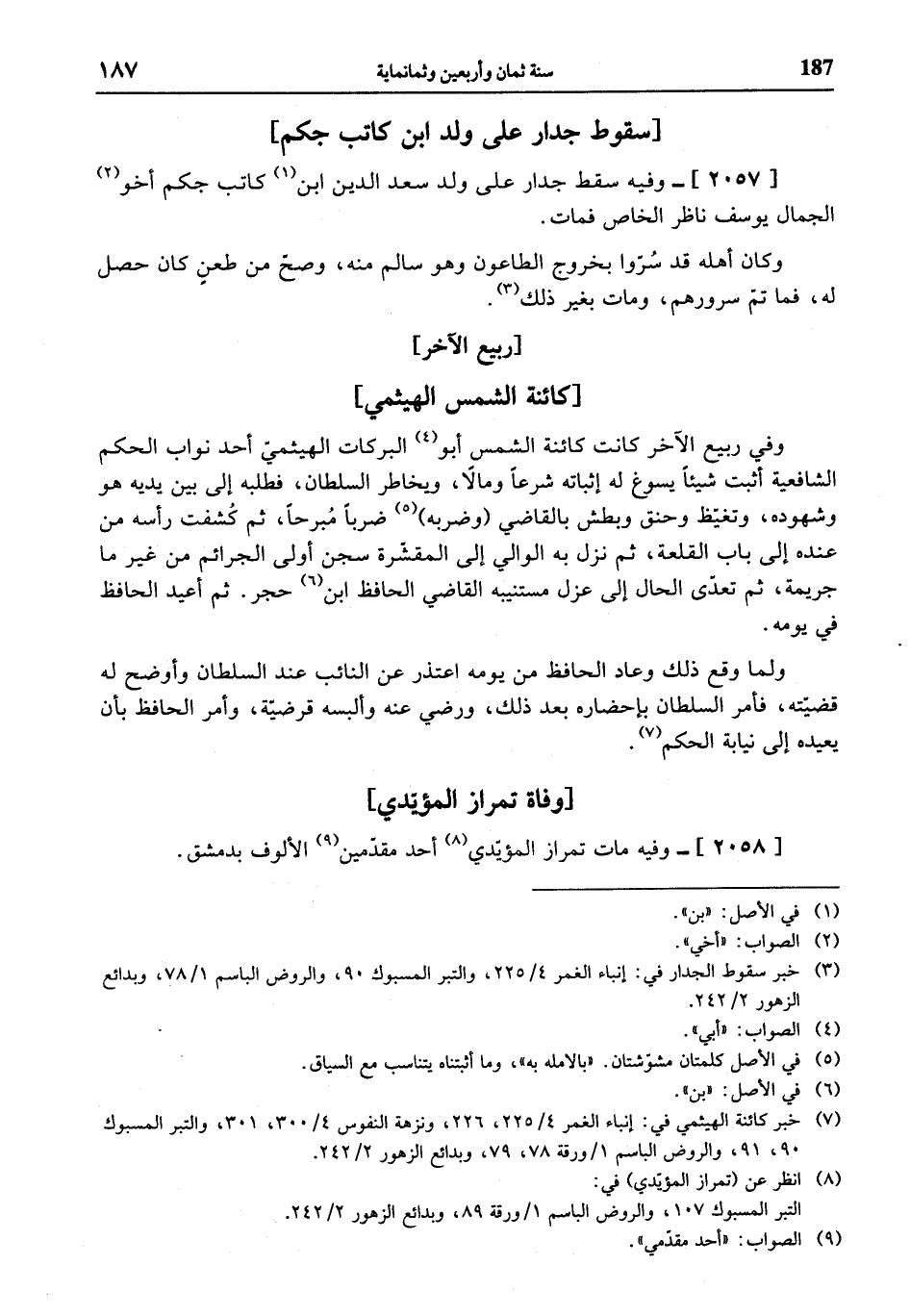 [2057]- وفيه سقط جدار على ولد سعد الدين ابن (¬1) كاتب جكم أخو (¬2) الجمال يوسف ناظر الخاص فمات.