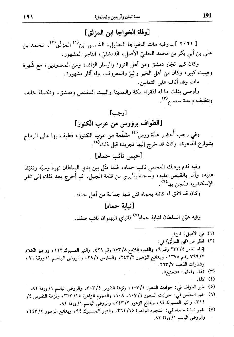 وفيه قدم بردبك العجمي نائب حماه، فلما مثل بين يدي السلطان نهره وسبّه وتغيّظ عليه، وأمر بالقبض عليه، وسجنه بالبرج من قلعة الجبل، ثم أخرج بعد ذلك إلى ثغر الإسكندرية فسجن بها (¬6).