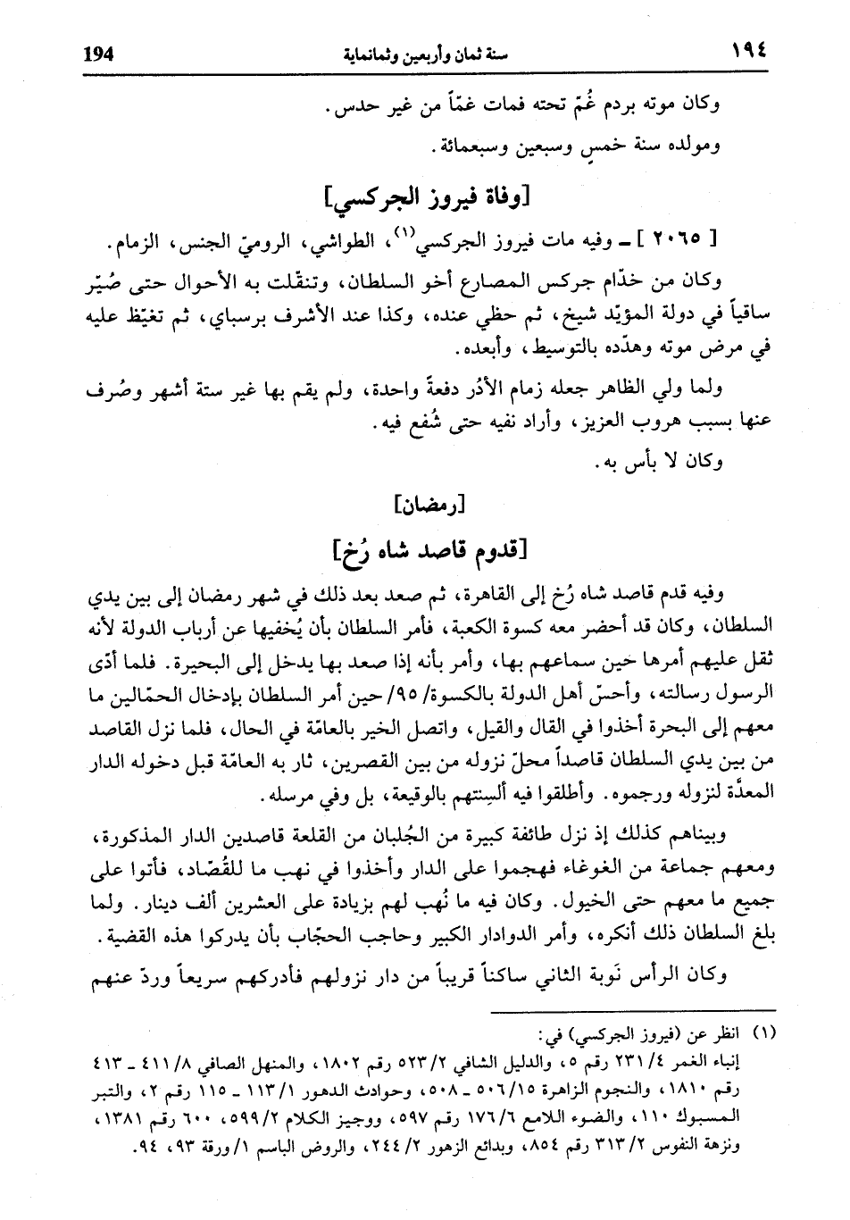 (¬1) انظر عن (فيروز الجركسي) في: إنباء الغمر 4/ 231 رقم 5، والدليل الشافي 2/ 523 رقم 1802، والمنهل الصافي 8/ 411 - 413 رقم 1810، والنجوم الزاهرة 15/ 506 - 508، وحوادث الدهور 1/ 113 - 115 رقم 2، والتبر المسبوك 110، والضوء اللامع 6/ 176 رقم 597، ووجيز الكلام 2/ 599، 600 رقم 1381، ونزهة النفوس 2/ 313 رقم 854، وبدائع الزهور 2/ 244، والروض الباسم 1 / ورقة 93، 94.