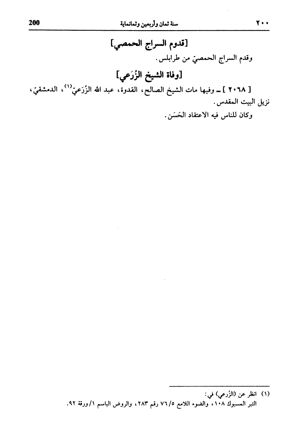 (¬1) انظر عن (الزرعي) في: التبر المسبوك 108، والضوء اللامع 5/ 76 رقم 283، والروض الباسم 1 / ورقة 92.