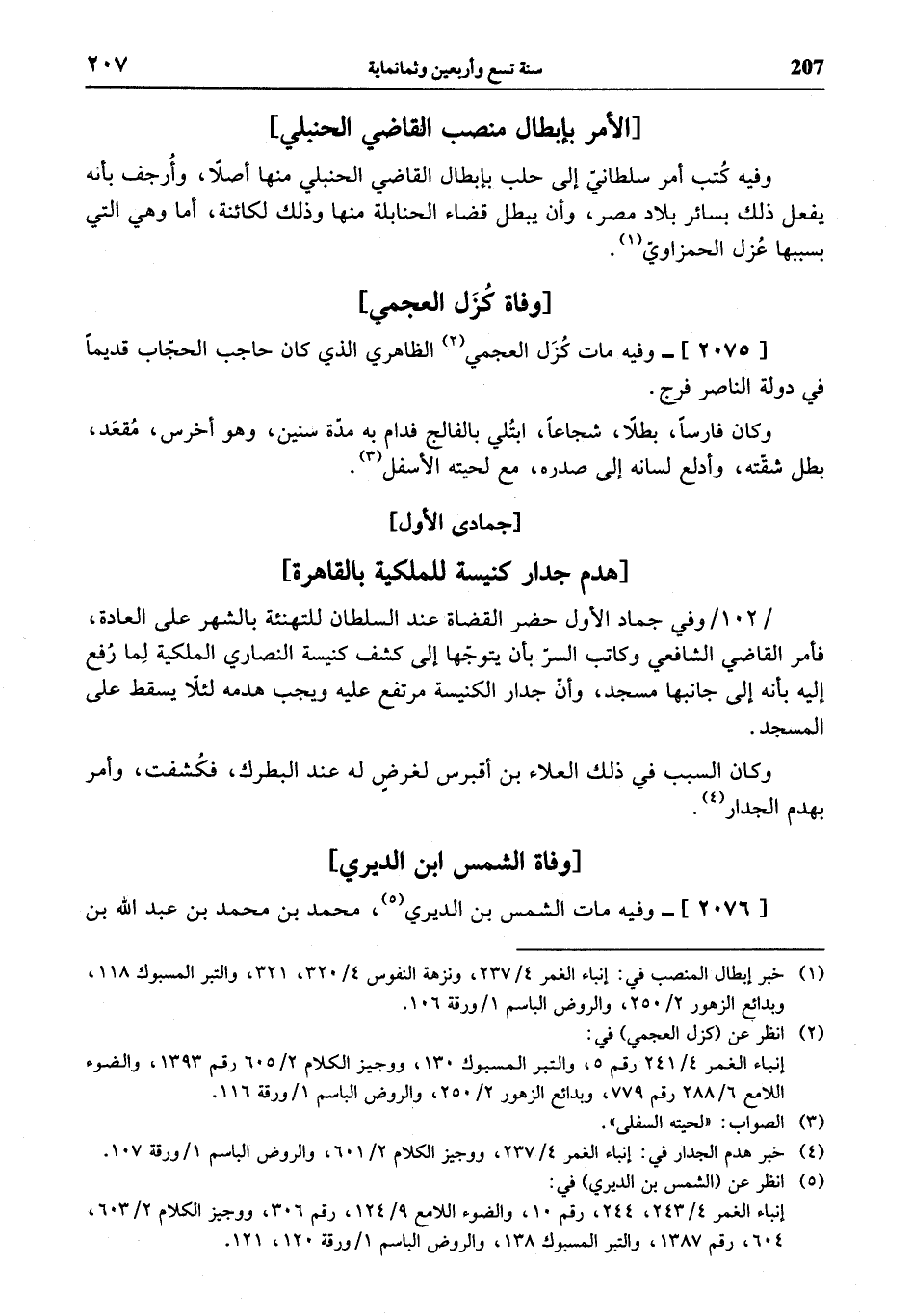 / 102 / وفي جماد الأول حضر القضاة عند السلطان للتهنئة بالشهر على العادة، فأمر القاضي الشافعي وكاتب السرّ بأن يتوجّها إلى كشف كنيسة النصارى الملكية لما رفع إليه بأنه إلى جانبها مسجد، وأنّ جدار الكنيسة مرتفع عليه ويجب هدمه لئلاّ يسقط على المسجد.