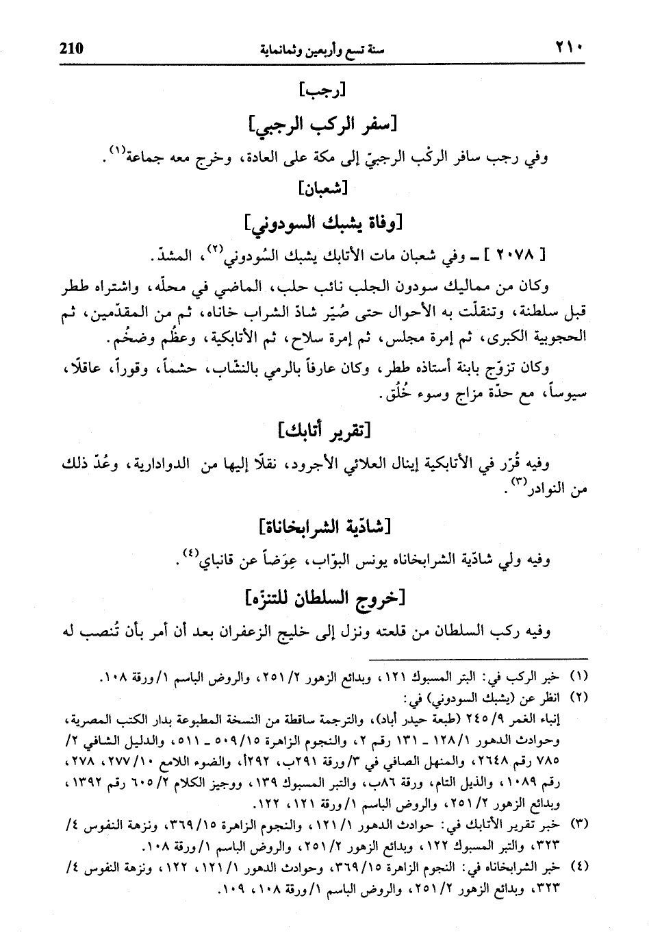 (¬4) خبر الشرابخاناه في: النجوم الزاهرة 15/ 369، وحوادث الدهور 1/ 121، 122، ونزهة النفوس 4/ 323، وبدائع الزهور 2/ 251، والروض الباسم 1 / ورقة 108، 109.