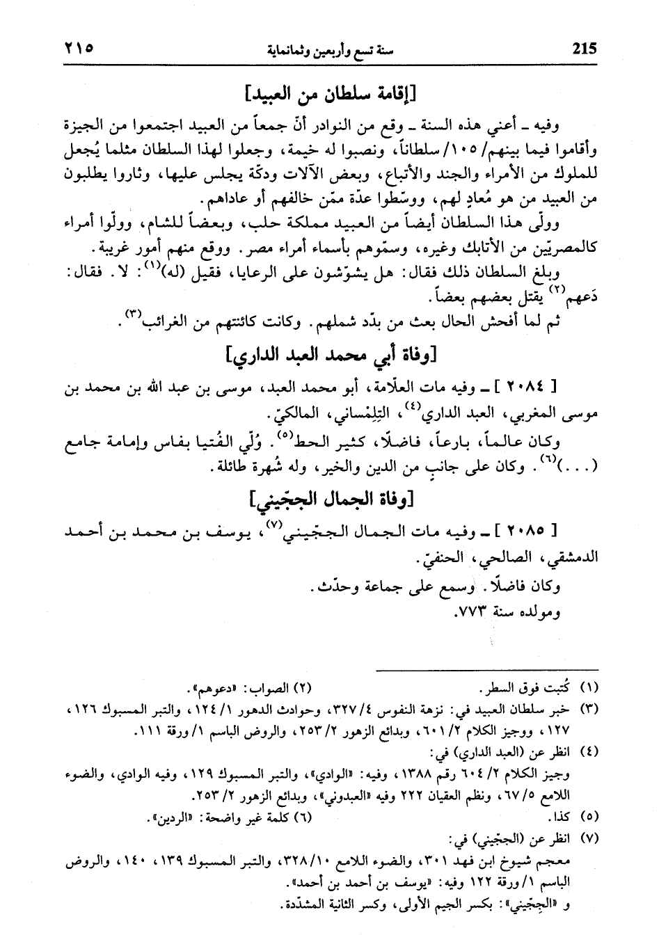 (¬4) انظر عن (العبد الداري) في: وجيز الكلام 2/ 604 رقم 1388، وفيه: «الوادي»، والتبر المسبوك 129، وفيه الوادي، والضوء اللامع 5/ 67، ونظم العقيان 222 وفيه «العبدوني»، وبدائع الزهور 2/ 253.