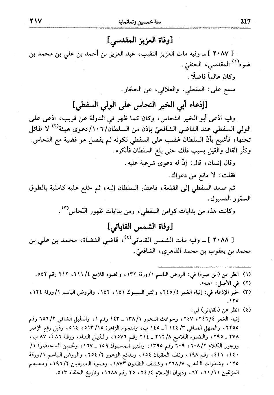 (¬4) انظر عن (القاياتي) في: إنباء الغمر 4/ 246، 247، وحوادث الدهور 1/ 138 - 143 رقم 1، والدليل الشافي 2/ 656 رقم 2255، والمنهل الصافي 3/ 144 أ - 145 ب، والنجوم الزاهرة 15/ 513، 514، وذيل رفع الإصر 278 - 295، والضوء اللامع 8/ 212 - 214 رقم 1576، والذيل التام، ورقة 86 أ، 87 ب، ووجيز الكلام 2/ 608، 609 رقم 1395، والتبر المسبوك 159 - 167، وحسن المحاضرة 1/ 440، 441، رقم 198، ونظم العقيان 154، وبدائع الزهور 2/ 254، والروض الباسم 1 / ورقة 125، وشذرات الذهب 7/ 268، وكشف الظنون 1873، وهدية العارفين 2/ 196، ومعجم المؤلفين 11/ 61، 62، وديوان الإسلام 4/ 24، 25 رقم 1688، وتاريخ الخلفاء 513.