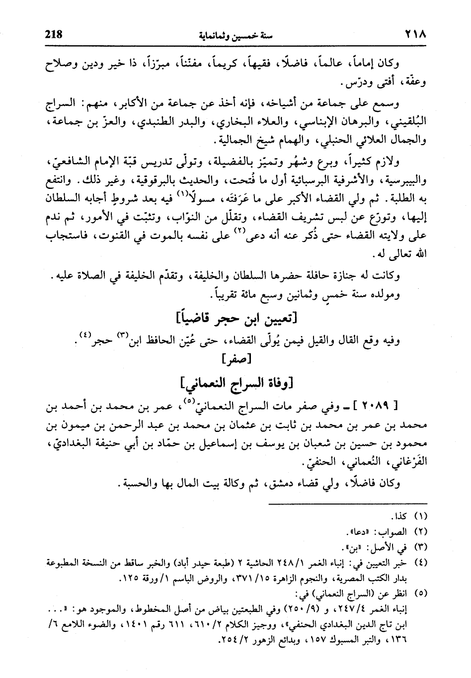 (¬5) انظر عن (السراج النعماني) في: إنباء الغمر 4/ 247، و (9/ 250) وفي الطبعتين بياض من أصل المخطوط، والموجود هو: «. . . ابن تاج الدين البغدادي الحنفي»، ووجيز الكلام 2/ 610، 611 رقم 1401، والضوء اللامع 6/ 136، والتبر المسبوك 157، وبدائع الزهور 2/ 254.
