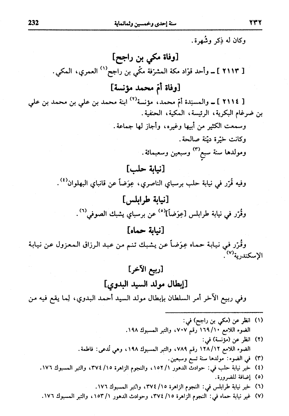 (¬4) خبر نيابة حلب في: حوادث الدهور 1/ 152، والنجوم الزاهرة 15/ 374، والتبر المسبوك 176.