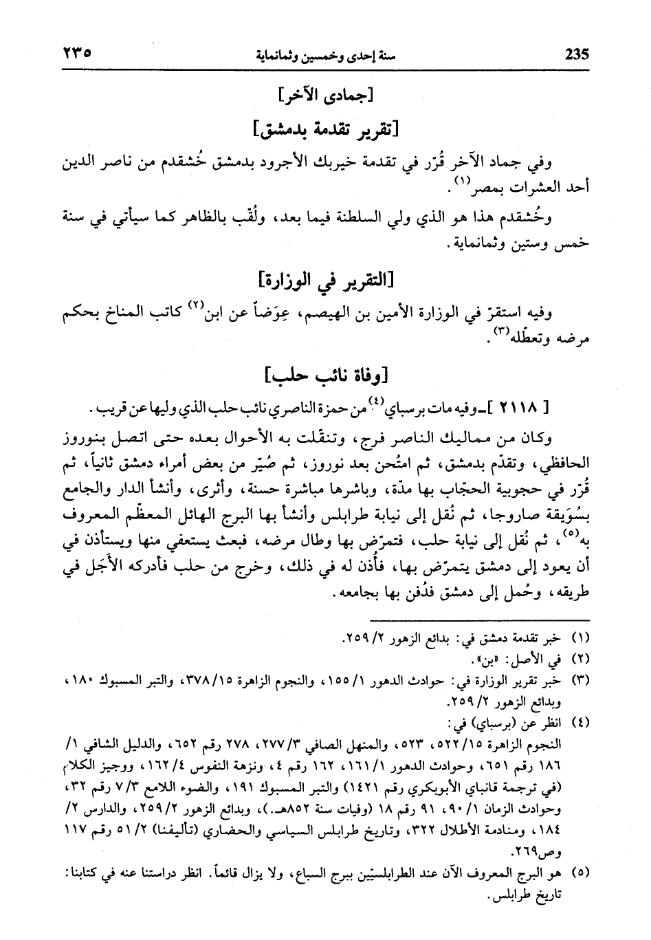 (¬5) هو البرج المعروف الآن عند الطرابلسيّين ببرج السباع، ولا يزال قائما. انظر دراستنا عنه في كتابنا: تاريخ طرابلس.