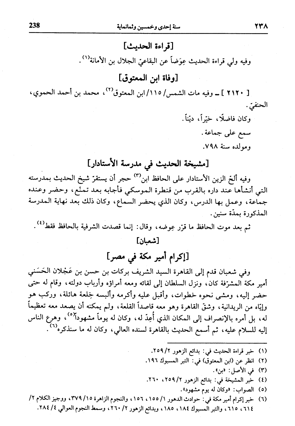 (¬6) خبر إكرام أمير مكة في: حوادث الدهور 1/ 155، 156، والنجوم الزاهرة 15/ 379، ووجيز الكلام 2/ 614، 615، والتبر المسبوك 184، 185، وبدائع الزهور 2/ 260، وسمط النجوم العوالي 4/ 284.