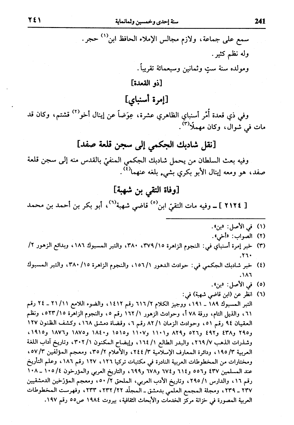 (¬6) انظر عن (ابن قاضي شهبة) في: التبر المسبوك 189 - 191، ووجيز الكلام 2/ 616 رقم 1412، والضوء اللامع 11/ 21 - 24 رقم 61، والذيل التام، ورقة 78 أ، وحوادث الزهور 1/ 162 رقم 5، والنجوم الزاهرة 15/ 523، ونظم العقيان 94 رقم 51، وحوادث الزمان 1/ 82 رقم 6، وقضاة دمشق 168، وكشف الظنون 127 و 295 و 438 و 492 و 526 و 829 و 1101 و 1107 و 1515 و 1840 و 1875 و 1876 و 1915، وشذرات الذهب 7/ 269، والبدر الطالع 1/ 164، وإيضاح المكنون 1/ 302، وتاريخ آداب اللغة العربية 3/ 195، ودائرة المعارف الإسلامية 3/ 244، والأعلام 2/ 35، ومعجم المؤلفين 3/ 57، ومختارات من المخطوطات العربية النادرة في مكتبات تركيا 126، 127 رقم 186، وعلم التأريخ عند المسلمين 437 و 556 و 614 و 674 و 678 و 699، والتاريخ العربي والمؤرخون 4/ 105 - 108 رقم 16، والدارس 1/ 295، وتاريخ الأدب العربي، الملحق 2/ 50، ومعجم المؤرّخين الدمشقيين 237 - 239، ومجلة المجمع العلمي بدمشق - المجلّد 22/ 232، 233، وفهرست المخطوطات العربية المصورة في خزانة مركز الخدمات والأبحاث الثقافية، بيروت 1984 ص 55 رقم 197.