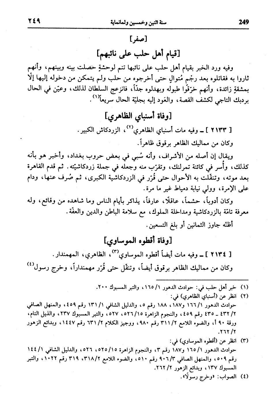 (¬2) انظر عن (أسنباي الظاهري) في: حوادث الدهور 1/ 165، 166 و 187، 188 رقم 5، والدليل الشافي 1/ 131 رقم 459، والمنهل الصافي 2/ 432 - 435 رقم 459، والنجوم الزاهرة 15/ 526، 527، والتبر المسبوك 237، والذيل التام، ورقة 90 أ، والضوء اللامع 2/ 311 رقم 980، ووجيز الكلام 2/ 631 رقم 1447، وبدائع الزهور 2/ 262.