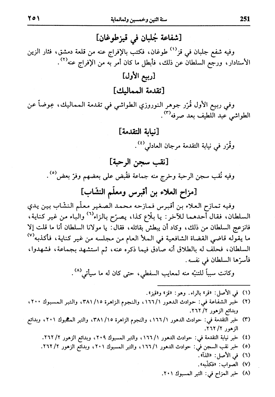(¬3) خبر نيابة التقدمة في: حوادث الدهور 1/ 166، والنجوم الزاهرة 15/ 381، والتبر المسبوك 201، وبدائع الزهور 2/ 262.