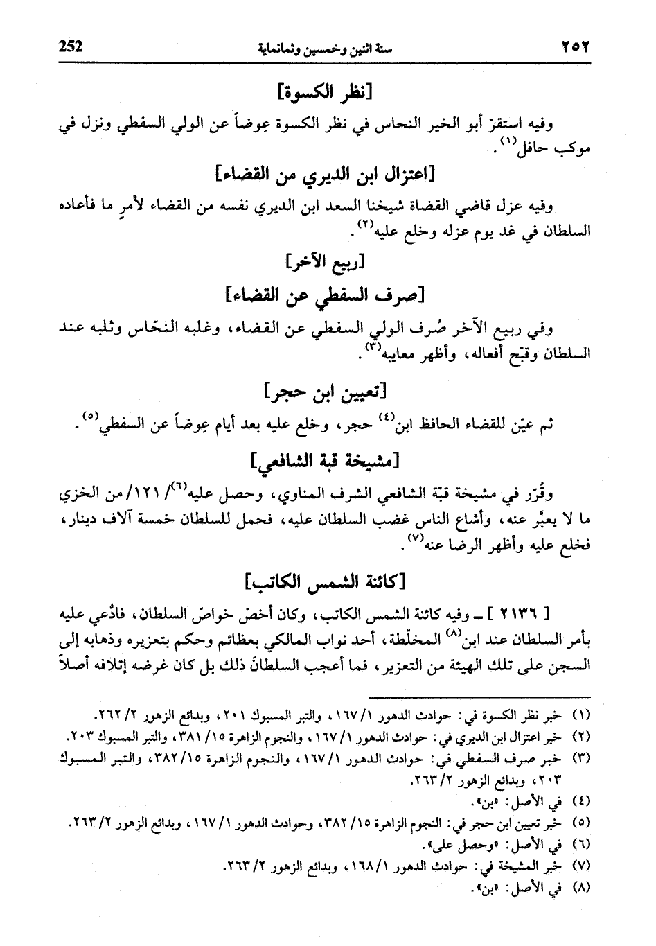 (¬5) خبر تعيين ابن حجر في: النجوم الزاهرة 15/ 382، وحوادث الدهور 1/ 167، وبدائع الزهور 2/ 263.