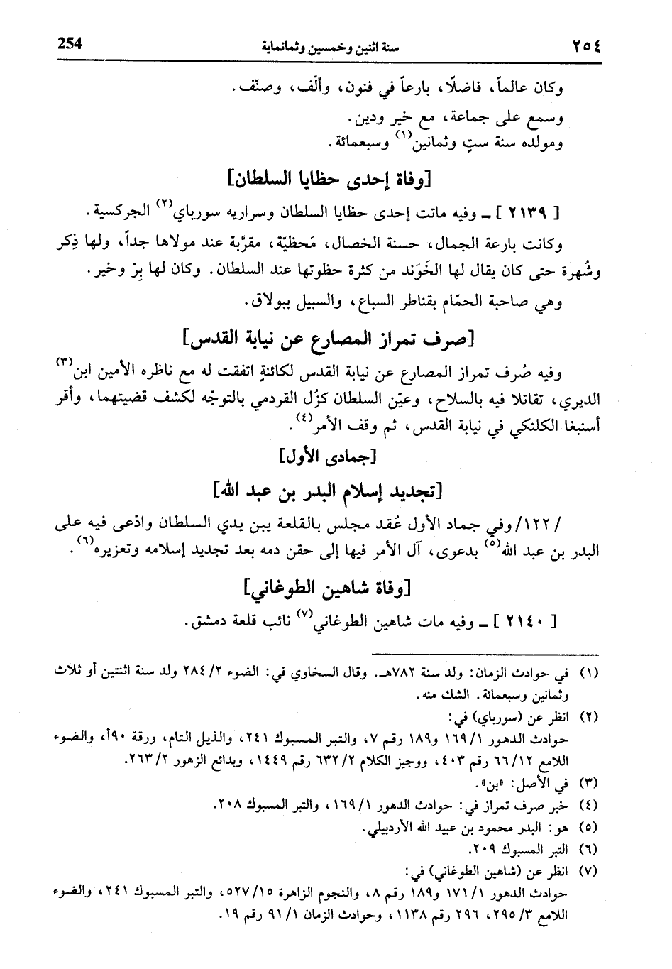 (¬7) انظر عن (شاهين الطوغاني) في: حوادث الدهور 1/ 171 و 189 رقم 8، والنجوم الزاهرة 15/ 527، والتبر المسبوك 241، والضوء اللامع 3/ 295، 296 رقم 1138، وحوادث الزمان 1/ 91 رقم 19.