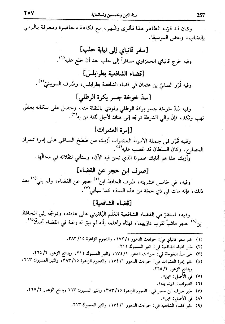 (¬9) خبر قضاء الشافعية في: حوادث الدهور 1/ 174، والتبر المسبوك 213.