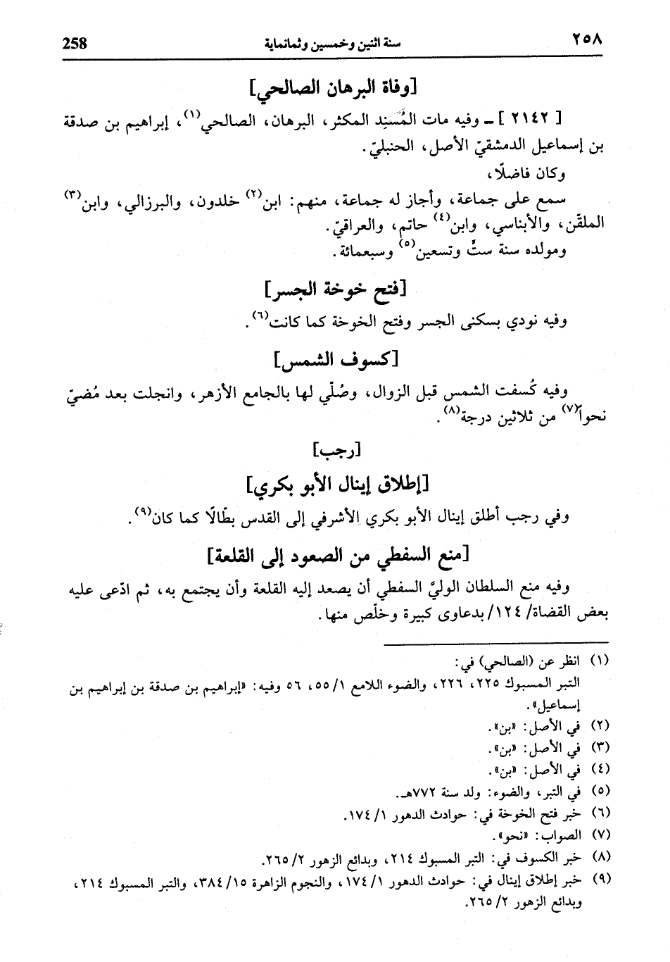(¬1) انظر عن (الصالحي) في: التبر المسبوك 225، 226، والضوء اللامع 1/ 55، 56 وفيه: «إبراهيم بن صدقة بن إبراهيم بن إسماعيل».