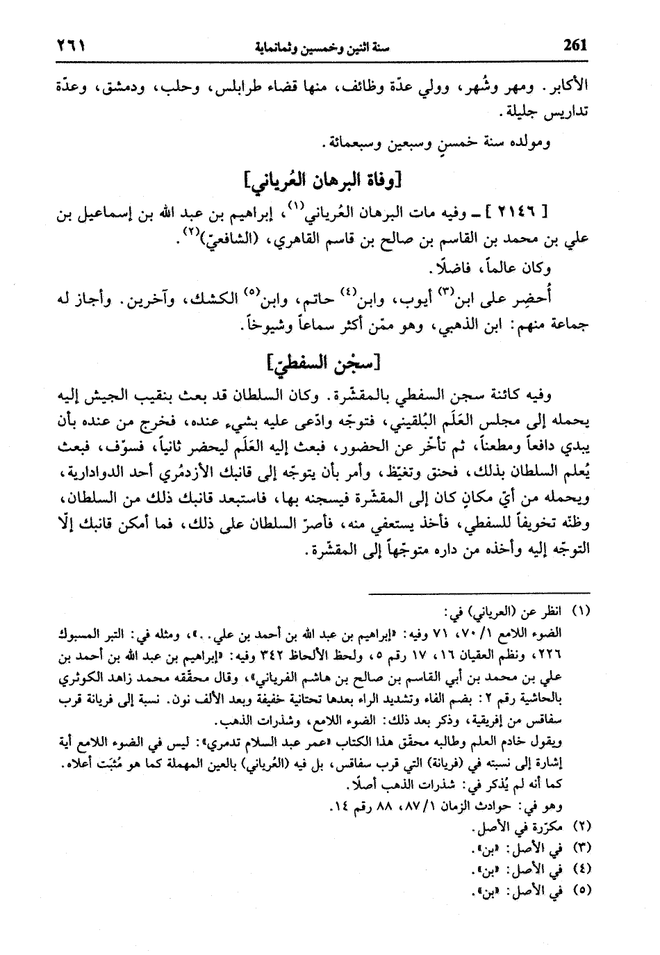 (¬1) انظر عن (العرياني) في: الضوء اللامع 1/ 70، 71 وفيه: «إبراهيم بن عبد الله بن أحمد بن علي. .»، ومثله في: التبر المسبوك 226، ونظم العقيان 16، 17 رقم 5، ولحظ الألحاظ 342 وفيه: «إبراهيم بن عبد الله بن أحمد بن علي بن محمد بن أبي القاسم بن صالح بن هاشم الفرياني»، وقال محقّقه محمد زاهد الكوثري بالحاشية رقم 2: بضم الفاء وتشديد الراء بعدها تحتانية خفيفة وبعد الألف نون. نسبة إلى فريانة قرب سفاقس من إفريقية، وذكر بعد ذلك: الضوء اللامع، وشذرات الذهب. ويقول خادم العلم وطالبه محقّق هذا الكتاب «عمر عبد السلام تدمري»: ليس في الضوء اللامع أية إشارة إلى نسبته في (فريانة) التي قرب سفاقس، بل فيه (العرياني) بالعين المهملة كما هو مثبت أعلاه. كما أنه لم يذكر في: شذرات الذهب أصلا. وهو في: حوادث الزمان 1/ 87، 88 رقم 14.