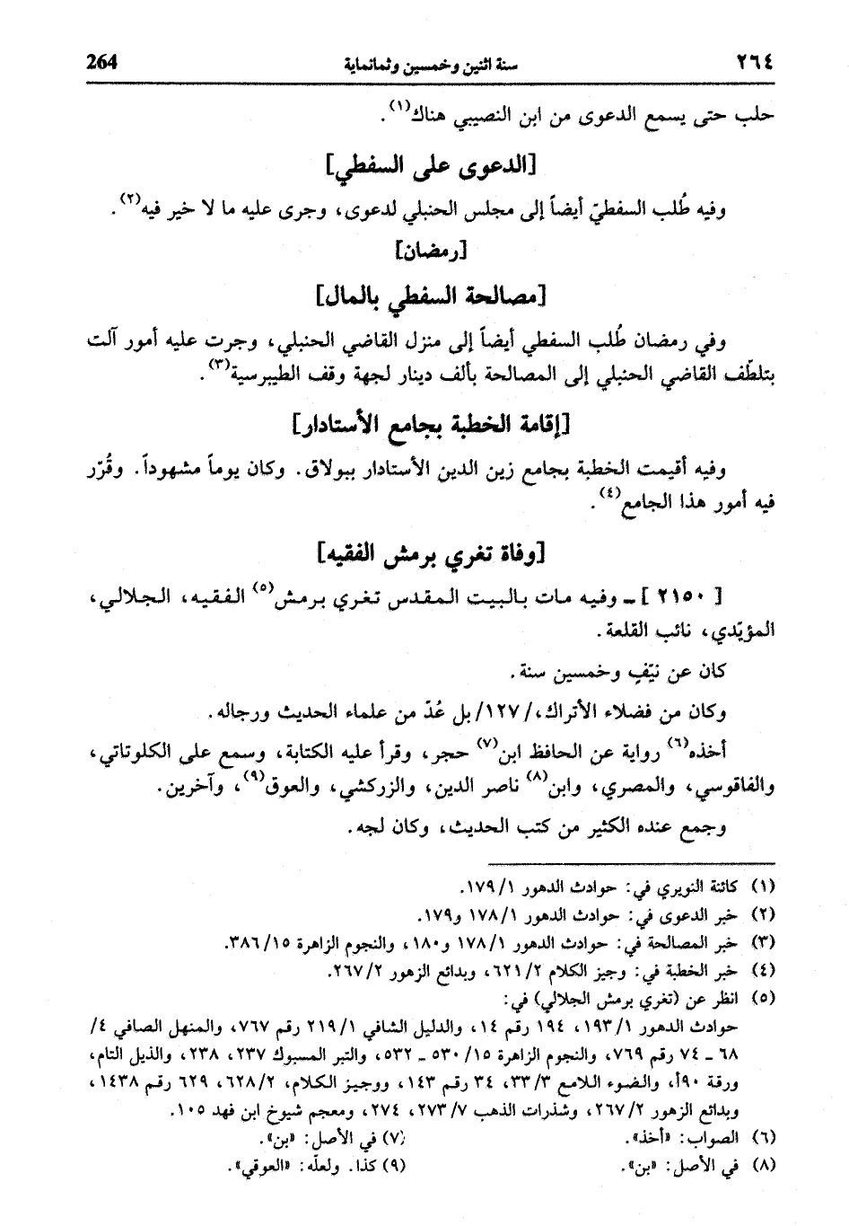 وفي رمضان طلب السفطي أيضا إلى منزل القاضي الحنبلي، وجرت عليه أمور آلت بتلطّف القاضي الحنبلي إلى المصالحة بألف دينار لجهة وقف الطيبرسية (¬3).
