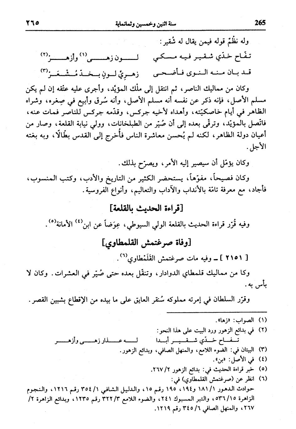 (¬6) انظر عن (صرغتمش القلمطاوي) في: حوادث الدهور 1/ 181 و 194، 195 رقم 15، والدليل الشافي 1/ 354 رقم 1216، والنجوم الزاهرة 15/ 536، والتبر المسبوك 241، والضوء اللامع 3/ 322 رقم 1235، وبدائع الزاهرة 2/ 267، والمنهل الصافي 6/ 345 رقم 1219.
