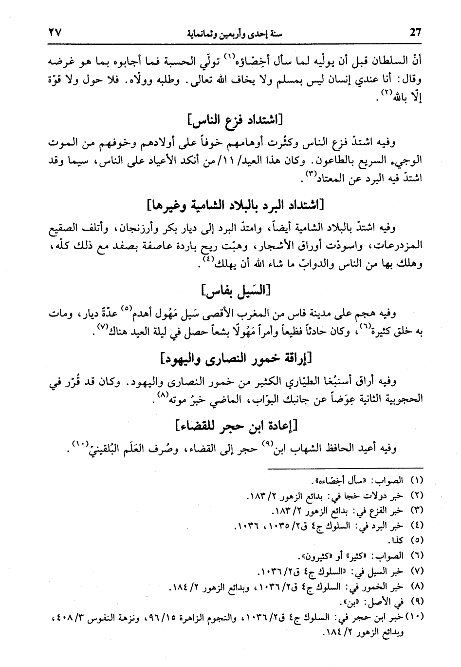 (¬10) خبر ابن حجر في: السلوك ج 4 ق 2/ 1036، والنجوم الزاهرة 15/ 96، ونزهة النفوس 3/ 408، وبدائع الزهور 2/ 184.