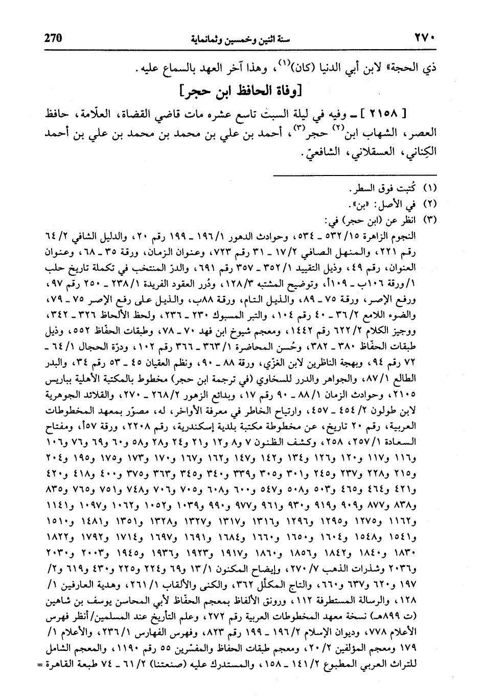 (¬3) انظر عن (ابن حجر) في: النجوم الزاهرة 15/ 532 - 534، وحوادث الدهور 1/ 196 - 199 رقم 20، والدليل الشافي 2/ 64 رقم 221، والمنهل الصافي 2/ 17 - 31 رقم 723، وعنوان الزمان، ورقة 35 - 68، وعنوان العنوان، رقم 49، وذيل التقييد 1/ 352 - 357 رقم 691، والدرّ المنتخب في تكملة تاريخ حلب 1 / ورقة 106 ب - 109 أ، وتوضيح المشتبه 3/ 128، ودرر العقود الفريدة 1/ 238 - 250 رقم 97، ورفع الإصر، ورقة 75 - 89، والذيل التام، ورقة 88 ب، والذيل على رفع الإصر 75 - 79، والضوء اللامع 2/ 36 - 40 رقم 104، والتبر المسبوك 230 - 236، ولحظ الألحاظ 326 - 342، ووجيز الكلام 2/ 622 رقم 1442، ومعجم شيوخ ابن فهد 70 - 78، وطبقات الحفّاظ 552، وذيل طبقات الحفّاظ 380 - 382، وحسن المحاضرة 1/ 363 - 366 رقم 102، ودرّة الحجال 1/ 64 - 72 رقم 94، وبهجة الناظرين لابن الغزّي، ورقة 88 - 90، ونظم العقيان 45 - 53 رقم 34، والبدر الطالع 1/ 87، والجواهر والدرر للسخاوي (في ترجمة ابن حجر) مخطوط بالمكتبة الأهلية بباريس 2105، وحوادث الزمان 1/ 88 - 90 رقم 17، وبدائع الزهور 2/ 268 - 270، والقلائد الجوهرية لابن طولون 2/ 454 - 457، وارتياح الخاطر في معرفة الأواخر، له، مصوّر بمعهد المخطوطات العربية، رقم 20 تاريخ، عن مخطوطة مكتبة بلدية إسكندرية، رقم 2208، ورقة 57 أ، ومفتاح السعادة 1/ 257، 258، وكشف الظنون 7 و 8 و 12 و 21 و 24 و 28 و 58 و 60 و 69 و 76 و 106 و 116 و 117 و 120 و 126 و 134 و 142 و 147 و 162 و 167 و 170 و 173 و 175 و 195 و 204 و 215 و 228 و 237 و 245 و 301 و 305 و 339 و 340 و 345 و 363 و 375 و 400 و 418 و 420 و 421 و 464 و 465 و 503 و 508 و 547 و 600 و 608 و 705 و 706 و 748 و 751 و 765 و 835 و 838 و 877 و 909 و 919 و 930 و 961 و 977 و 990 و 1039 و 1052 و 1062 و 1097 و 1141 و 1162 و 1275 و 1295 و 1296 و 1316 و 1317 و 1327 و 1328 و 1351 و 1481 و 1510 و 1541 و 1548 و 1604 و 1650 و 1660 و 1684 و 1691 و 1697 و 1714 و 1792 و 1822 و 1830 و 1840 و 1842 و 1856 و 1860 و 1917 و 1923 و 1936 و 1945 و 2003 و 2030 و 2036 وشذرات الذهب 7/ 270، وإيضاح المكنون 1/ 13 و 69 و 224 و 225 و 430 و 619 و 2/ 197 و 620 و 637 و 660، والتاج المكلّل 362، والكنى والألقاب 1/ 261، وهدية العارفين 1/ 128، والرسالة المستطرفة 112، ورونق الألفاظ بمعجم الحفّاظ لأبي المحاسن يوسف بن شاهين (ت 899 هـ) نسخة معهد المخطوطات العربية رقم 272، وعلم التأريخ عند المسلمين / أنظر فهرس الأعلام 778، وديوان الإسلام 2/ 196 - 199 رقم 823، وفهرس الفهارس 1/ 236، والأعلام 1/ 179 ومعجم المؤلفين 2/ 20، ومعجم طبقات الحفاظ والمفسّرين 55 رقم 1190، والمعجم الشامل للتراث العربي المطبوع 2/ 141 - 158، والمستدرك عليه (صنعتنا) 2/ 61 - 74 طبعة القاهرة =