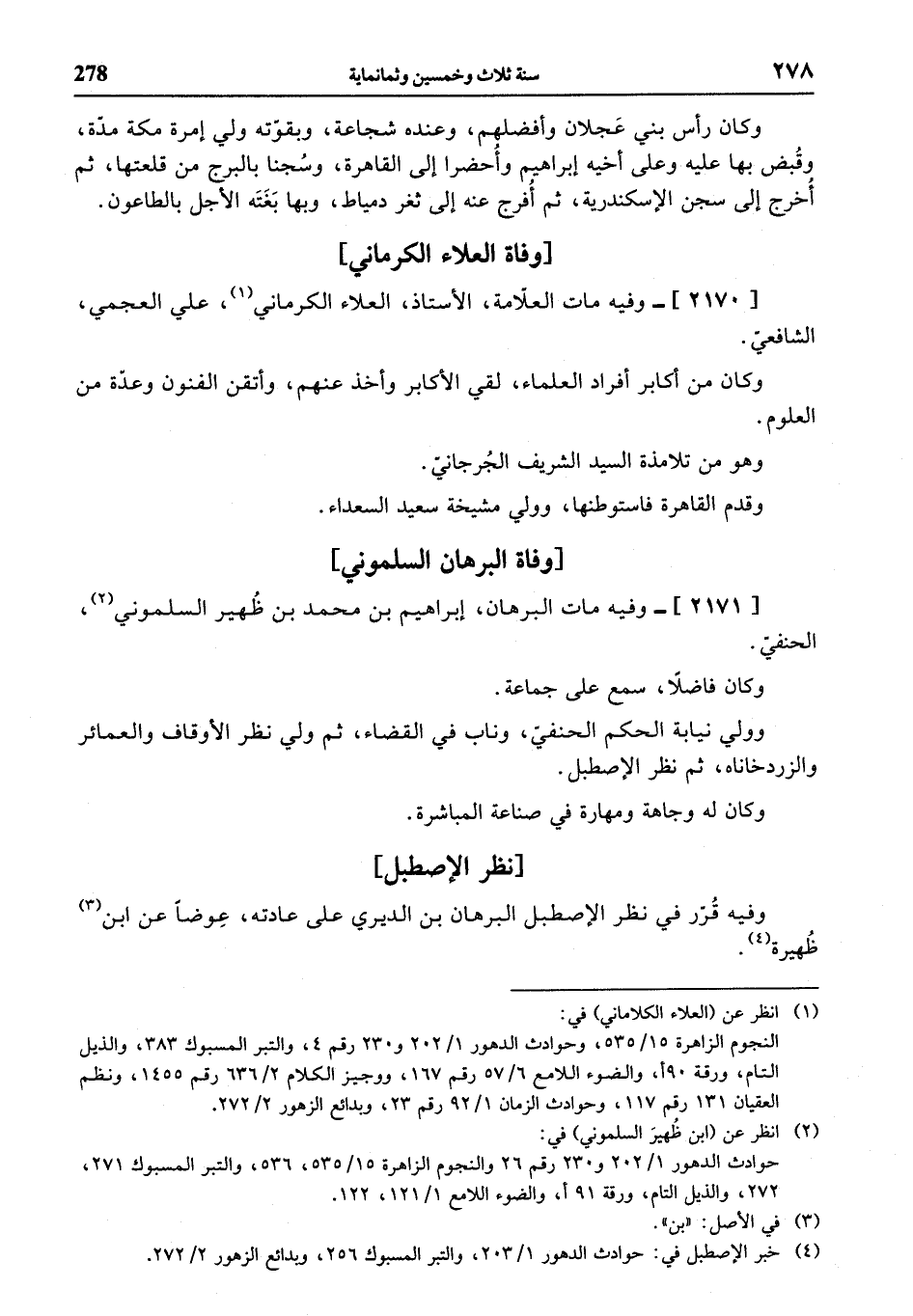 (¬1) انظر عن (العلاء الكلاماني) في: النجوم الزاهرة 15/ 535، وحوادث الدهور 1/ 202 و 230 رقم 4، والتبر المسبوك 383، والذيل التام، ورقة 90 أ، والضوء اللامع 6/ 57 رقم 167، ووجيز الكلام 2/ 636 رقم 1455، ونظم العقيان 131 رقم 117، وحوادث الزمان 1/ 92 رقم 23، وبدائع الزهور 2/ 272.