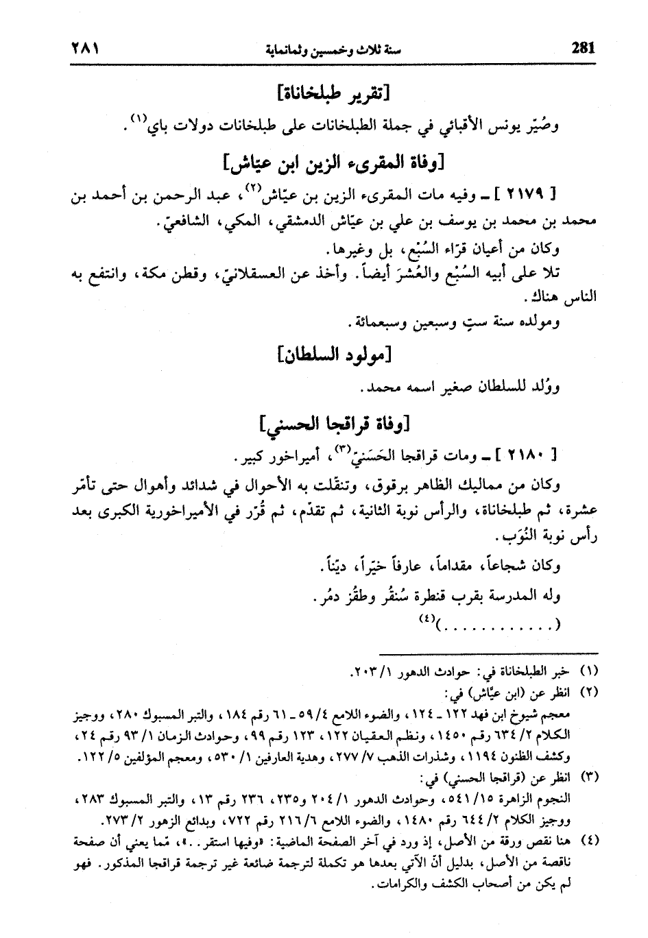 (¬4) هنا نقص ورقة من الأصل، إذ ورد في آخر الصفحة الماضية: «وفيها استقر. .»، مّما يعني أن صفحة ناقصة من الأصل، بدليل أنّ الآتي بعدها هو تكملة لترجمة ضائعة غير ترجمة قراقجا المذكور. فهو لم يكن من أصحاب الكشف والكرامات.
