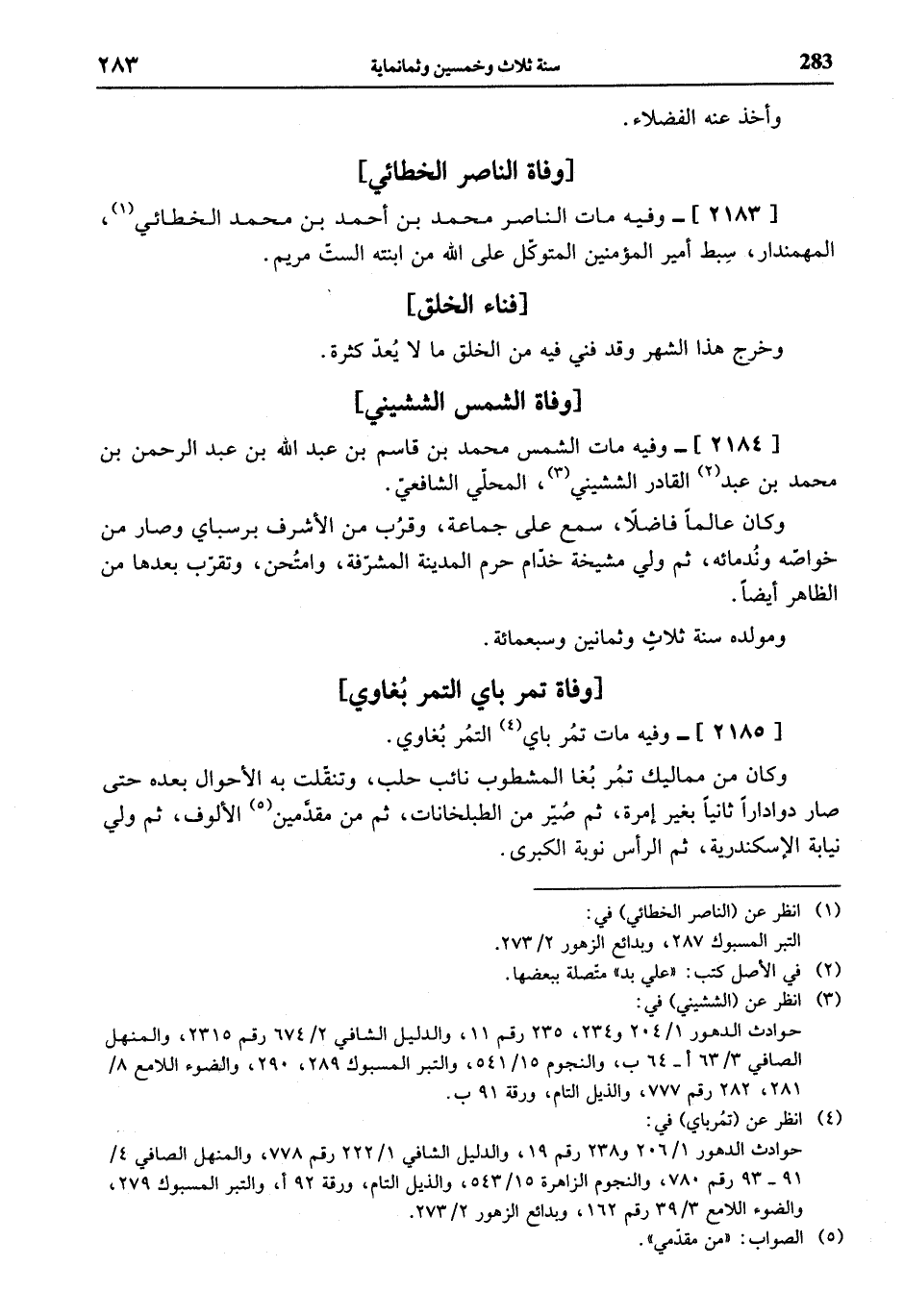 (¬3) انظر عن (الششيني) في: حوادث الدهور 1/ 204 و 234، 235 رقم 11، والدليل الشافي 2/ 674 رقم 2315، والمنهل الصافي 3/ 63 أ - 64 ب، والنجوم 15/ 541، والتبر المسبوك 289، 290، والضوء اللامع 8/ 281، 282 رقم 777، والذيل التام، ورقة 91 ب.