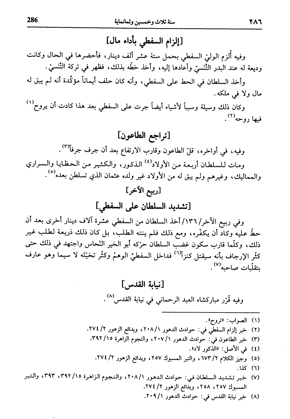 وفي ربيع الآخر / 136 / أخذ السلطان من السفطي عشرة آلاف دينار أخرى بعد أن حطّ عليه وكاد أن يكفّره، ومع ذلك فلم ينته الطلب، بل كان ذلك ذريعة لطلب غير ذلك، وكلّما قارب سكون غضب السلطان حرّكه أبو الخير النّحاس واجتهد في ذلك حتى كثر الإرجاف بأنه سيقتل كنزا (¬6) فداخل السفطيّ الوهم وكثر تخيّله لا سيما وهو عارف بتقلّبات صاحبه (¬7).