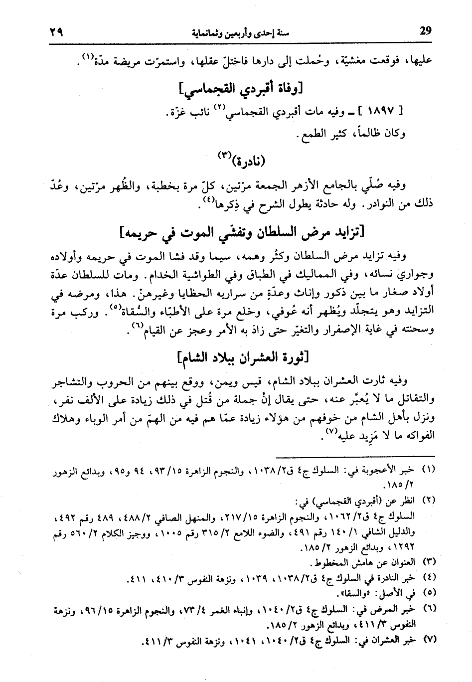 (¬6) خبر المرض في: السلوك ج 4 ق 2/ 1040، وإنباء الغمر 4/ 73، والنجوم الزاهرة 15/ 96، ونزهة النفوس 3/ 411، وبدائع الزهور 2/ 185.