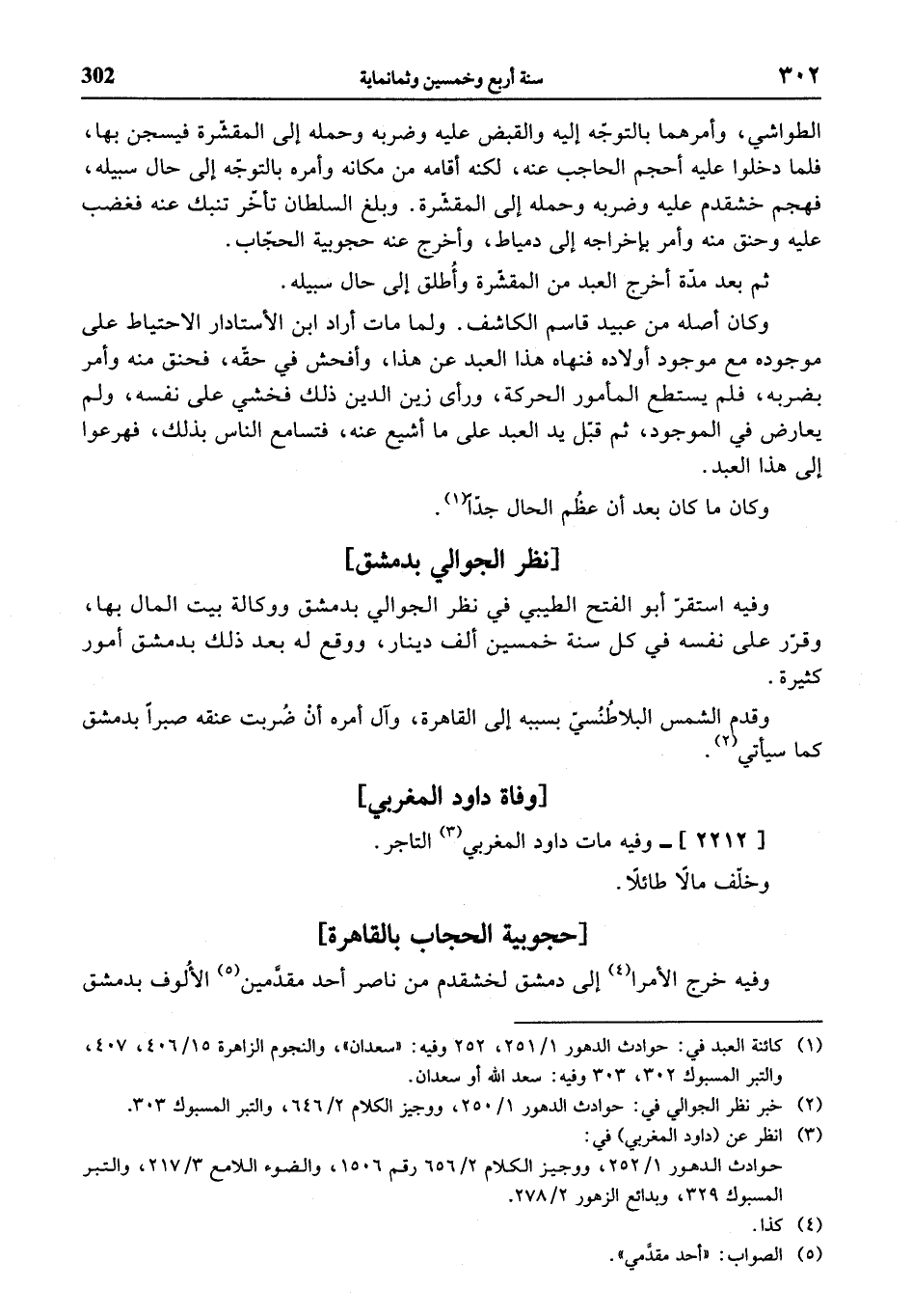 (¬2) خبر نظر الجوالي في: حوادث الدهور 1/ 250، ووجيز الكلام 2/ 646، والتبر المسبوك 303.