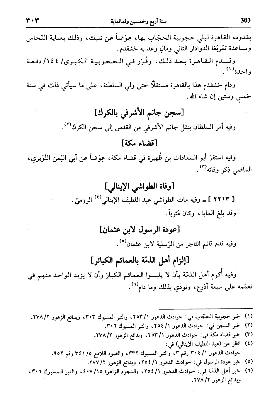 (¬6) خبر أهل الذمّة في: حوادث الدهور 1/ 254، والنجوم الزاهرة 15/ 407، والتبر المسبوك 306، وبدائع الزهور 2/ 278.