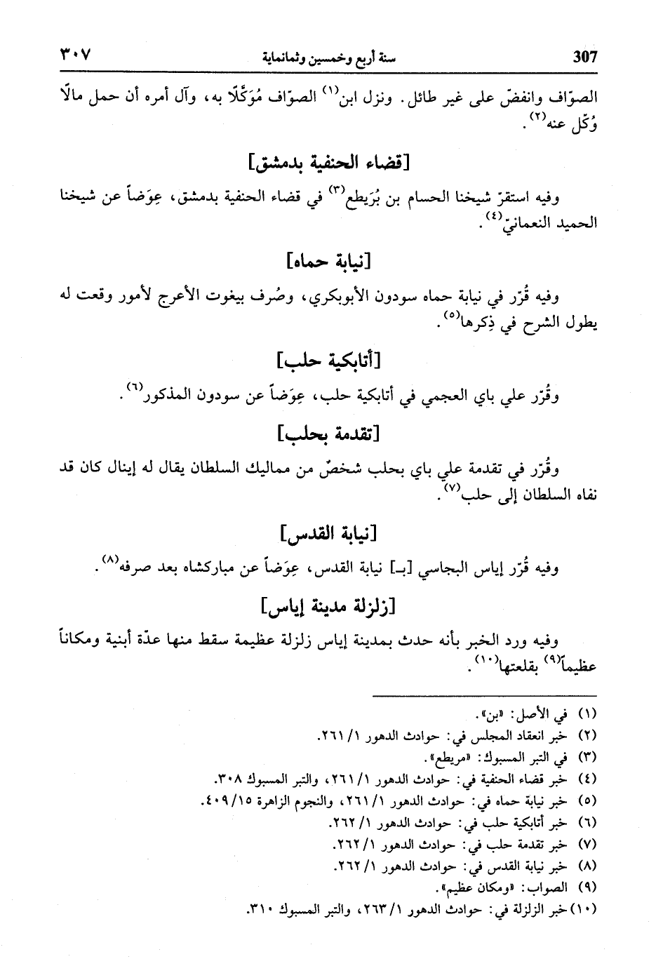 (¬5) خبر نيابة حماه في: حوادث الدهور 1/ 261، والنجوم الزاهرة 15/ 409.