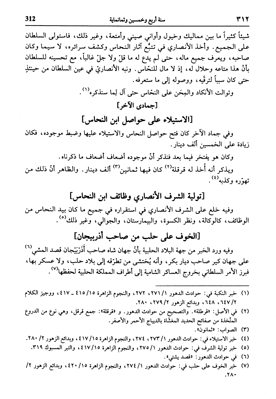 (¬7) خبر الخوف على حلب في: حوادث الدهور 1/ 274، والنجوم الزاهرة 15/ 420، وبدائع الزهور 2/ 280.