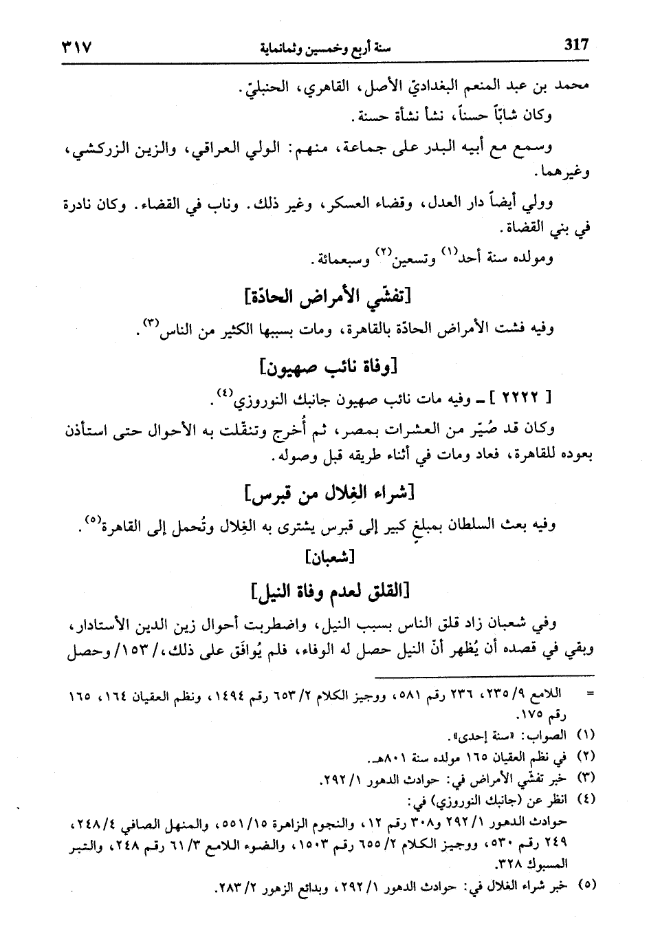 (¬5) خبر شراء الغلال في: حوادث الدهور 1/ 292، وبدائع الزهور 2/ 283.