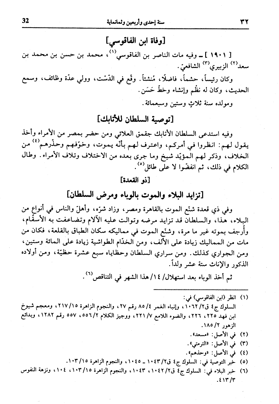 (¬6) خبر البلاء في: السلوك ج 4 ق 2/ 1042، 1043، والنجوم الزاهرة 15/ 103، 104، ونزهة النفوس 3/ 413.