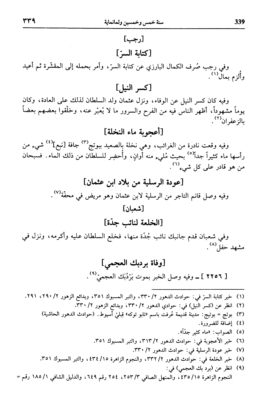 (¬1) خبر كتابة السرّ في: حوادث الدهور 2/ 330، والتبر المسبوك 351، وبدائع الزهور 2/ 290، 291.