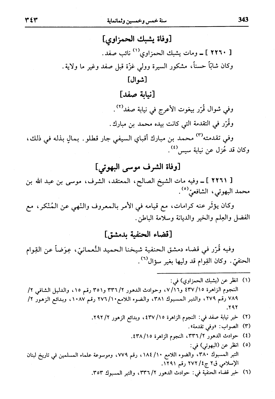 (¬5) انظر عن (البهوتي) في: التبر المسبوك 380، والضوء اللامع 10/ 184، رقم 779، وموسوعة علماء المسلمين في تاريخ لبنان الإسلامي ق 2 ج 4/ 272 رقم 1291.