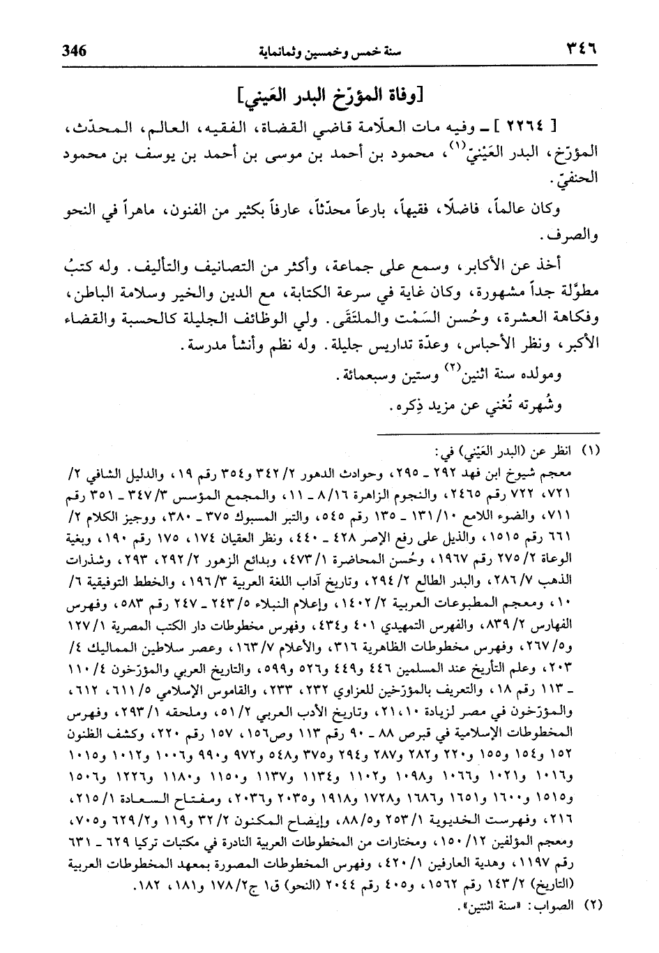 (¬1) انظر عن (البدر العيني) في: معجم شيوخ ابن فهد 292 - 295، وحوادث الدهور 2/ 342 و 354 رقم 19، والدليل الشافي 2/ 721، 722 رقم 2465، والنجوم الزاهرة 16/ 8 - 11، والمجمع المؤسس 3/ 347 - 351 رقم 711، والضوء اللامع 10/ 131 - 135 رقم 545، والتبر المسبوك 375 - 380، ووجيز الكلام 2/ 661 رقم 1515، والذيل على رفع الإصر 428 - 440، ونظر العقيان 174، 175 رقم 190، وبغية الوعاة 2/ 275 رقم 1967، وحسن المحاضرة 1/ 473، وبدائع الزهور 2/ 292، 293، وشذرات الذهب 7/ 286، والبدر الطالع 2/ 294، وتاريخ آداب اللغة العربية 3/ 196، والخطط التوفيقية 6/ 10، ومعجم المطبوعات العربية 2/ 1402، وإعلام النبلاء 5/ 243 - 247 رقم 583، وفهرس الفهارس 2/ 839، والفهرس التمهيدي 401 و 434، وفهرس مخطوطات دار الكتب المصرية 1/ 127 و 5/ 267، وفهرس مخطوطات الظاهرية 316، والأعلام 7/ 163، وعصر سلاطين المماليك 4/ 203، وعلم التأريخ عند المسلمين 446 و 449 و 526 و 599، والتاريخ العربي والمؤرّخون 4/ 110 - 113 رقم 18، والتعريف بالمؤرّخين للعزاوي 232، 233، والقاموس الإسلامي 5/ 611، 612، والمؤرّخون في مصر لزيادة 10، 21، وتاريخ الأدب العربي 2/ 51، وملحقه 1/ 293، وفهرس المخطوطات الإسلامية في قبرص 88 - 90 رقم 113 وص 156، 157 رقم 220، وكشف الظنون 152 و 154 و 155 و 220 و 282 و 287 و 294 و 375 و 548 و 972 و 990 و 1006 و 1012 و 1015 و 1016 و 1021 و 1066 و 1098 و 1102 و 1134 و 1137 و 1150 و 1180 و 1226 و 1506 و 1515 و 1600 و 1651 و 1686 و 1728 و 1918 و 2035 و 2036، ومفتاح السعادة 1/ 215، 216، وفهرست الخديوية 1/ 253 و 5/ 88، وإيضاح المكنون 2/ 32 و 119 و 2/ 629 و 705، ومعجم المؤلفين 12/ 150، ومختارات من المخطوطات العربية النادرة في مكتبات تركيا 629 - 631 رقم 1197، وهدية العارفين 1/ 420، وفهرس المخطوطات المصورة بمعهد المخطوطات العربية (التاريخ) 2/ 143 رقم 1562، و 405 رقم 2044 (النحو) ق 1 ج 2/ 178 و 181، 182.