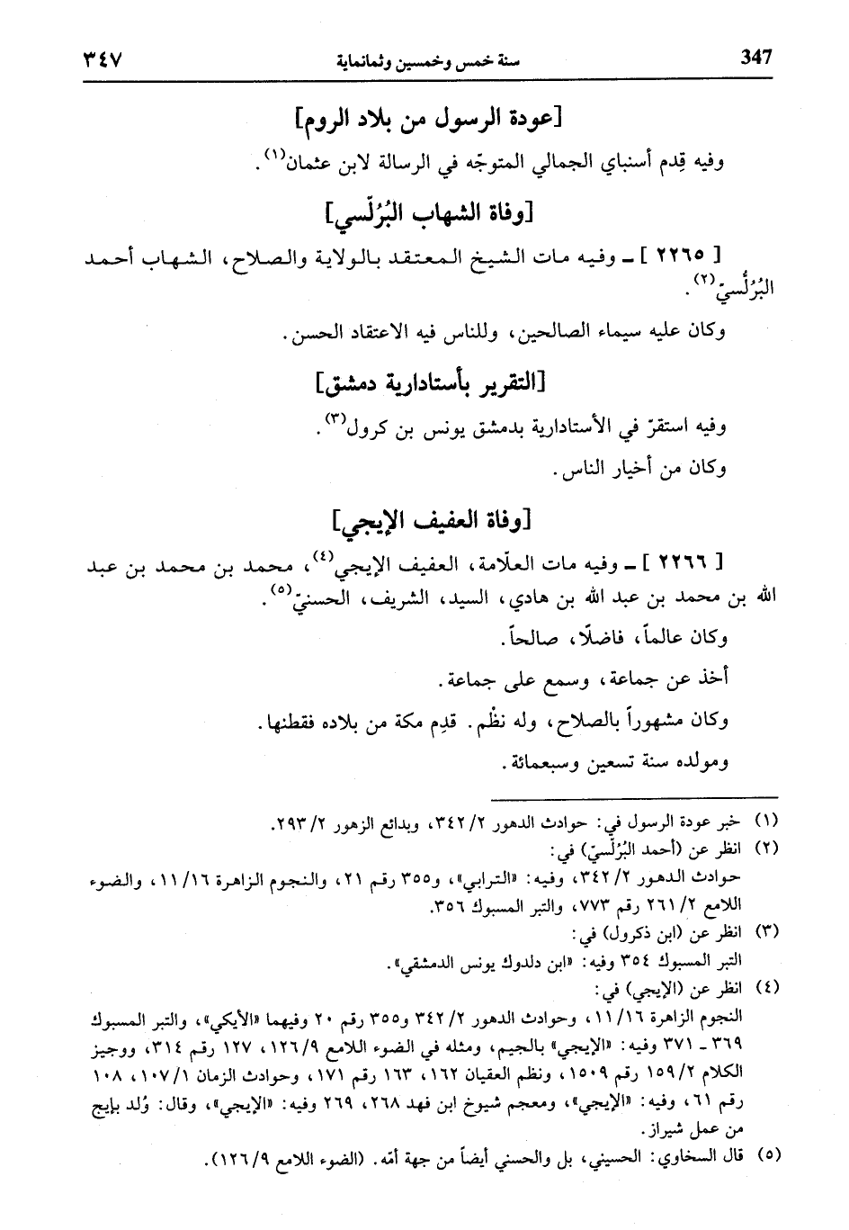 (¬2) انظر عن (أحمد البرلّسيّ) في: حوادث الدهور 2/ 342، وفيه: «الترابي»، و 355 رقم 21، والنجوم الزاهرة 16/ 11، والضوء اللامع 2/ 261 رقم 773، والتبر المسبوك 356.