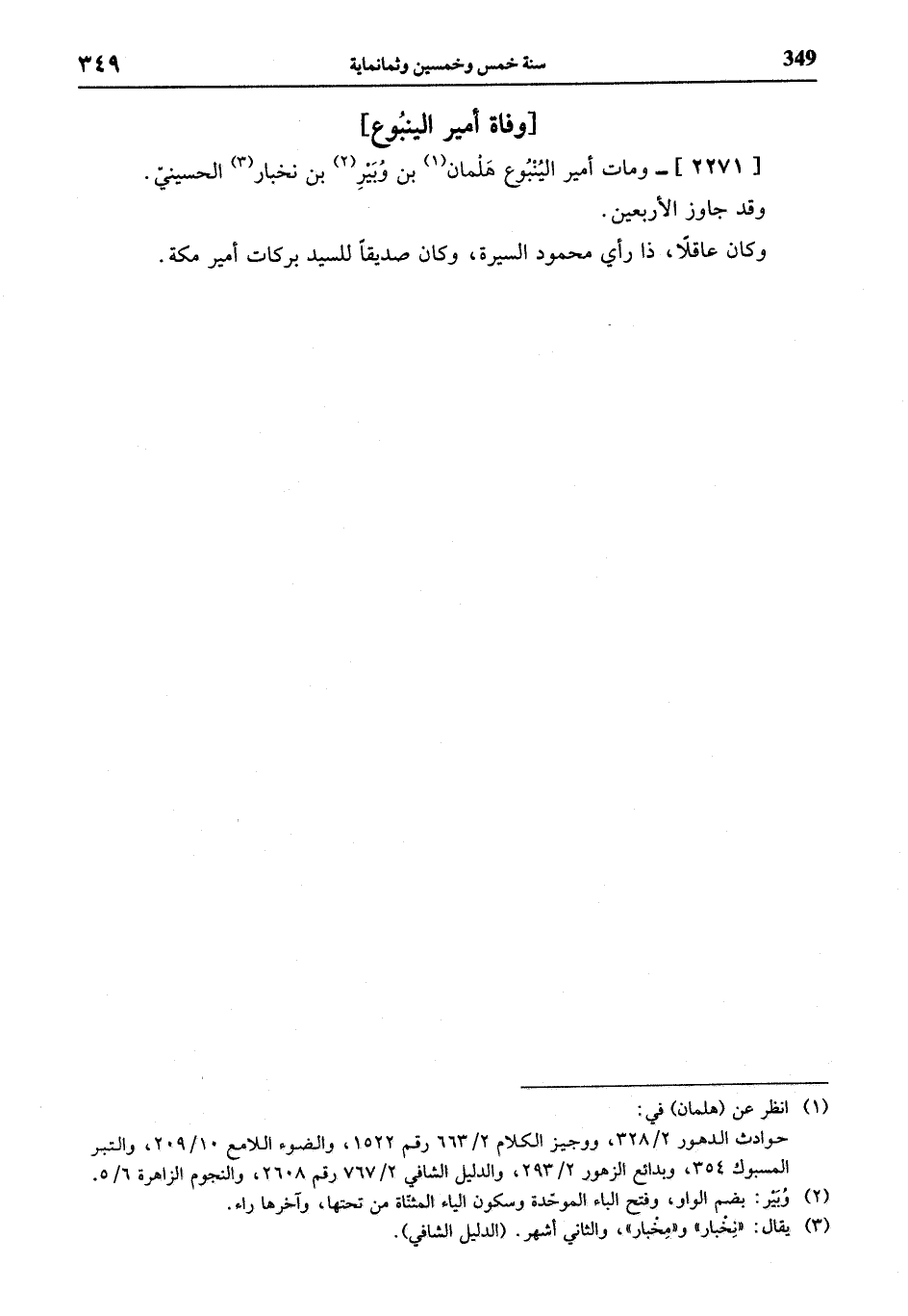[2271]- ومات أمير الينبوع هلمان (¬1) بن وبير (¬2) بن نخبار (¬3) الحسينيّ. وقد جاوز الأربعين.