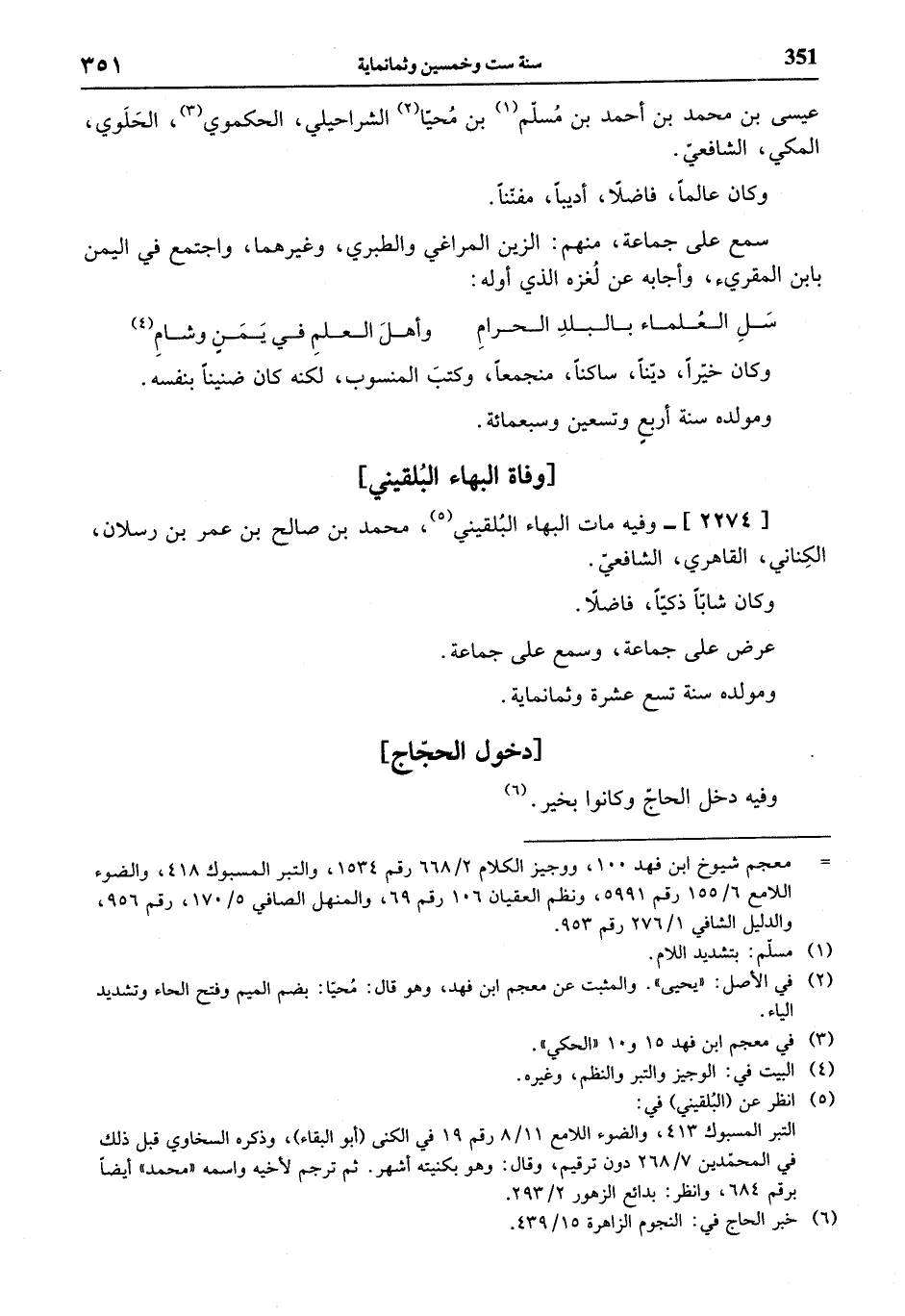 (¬5) انظر عن (البلقيني) في: التبر المسبوك 413، والضوء اللامع 11/ 8 رقم 19 في الكنى (أبو البقاء)، وذكره السخاوي قبل ذلك في المحمّدين 7/ 268 دون ترقيم، وقال: وهو بكنيته أشهر. ثم ترجم لأخيه واسمه «محمد» أيضا برقم 684، وانظر: بدائع الزهور 2/ 293.