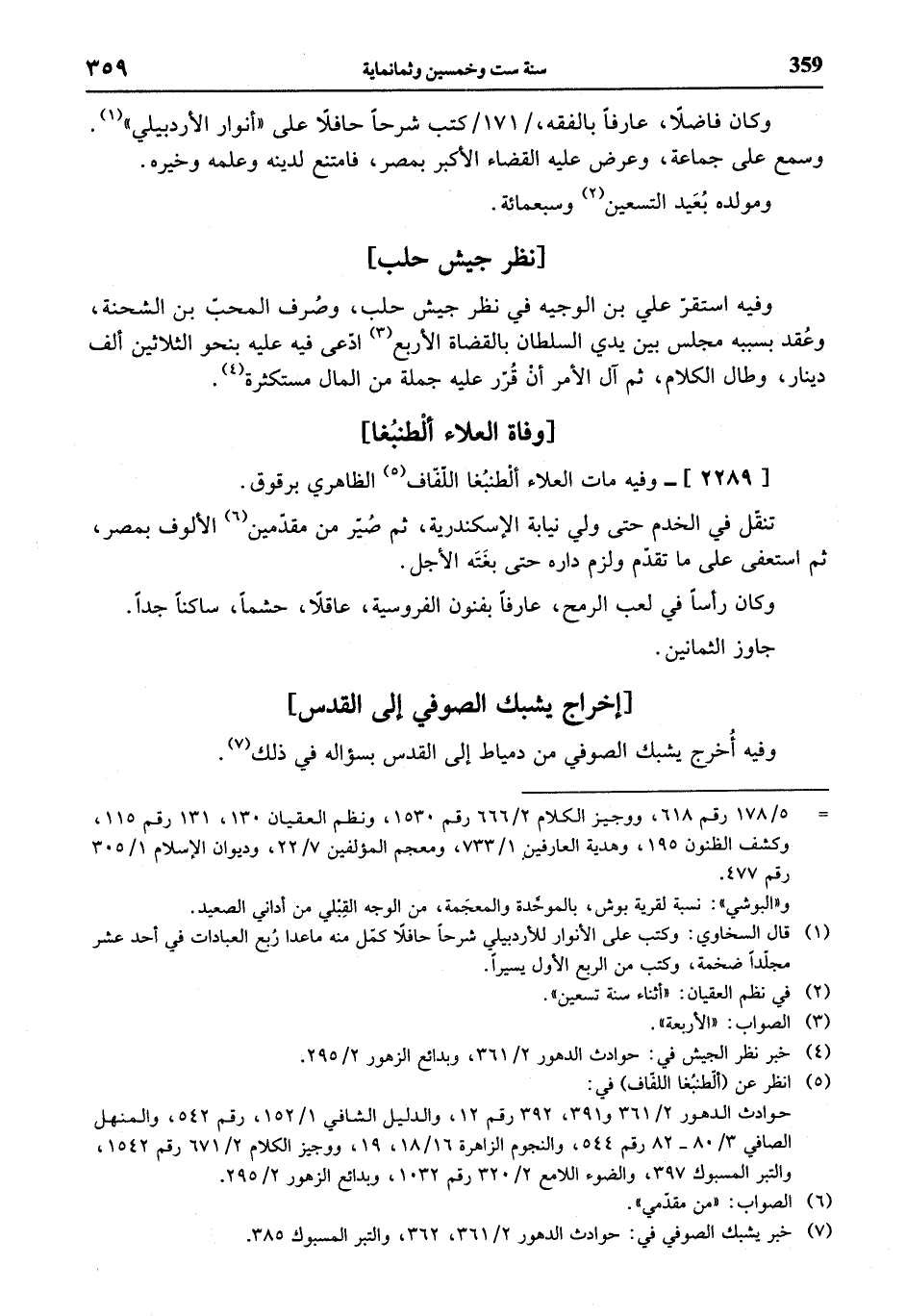 (¬5) انظر عن (ألطنبغا اللفّاف) في: حوادث الدهور 2/ 361 و 391، 392 رقم 12، والدليل الشافي 1/ 152، رقم 542، والمنهل الصافي 3/ 80 - 82 رقم 544، والنجوم الزاهرة 16/ 18، 19، ووجيز الكلام 2/ 671، رقم 1542، والتبر المسبوك 397، والضوء اللامع 2/ 320 رقم 1032، وبدائع الزهور 2/ 295.
