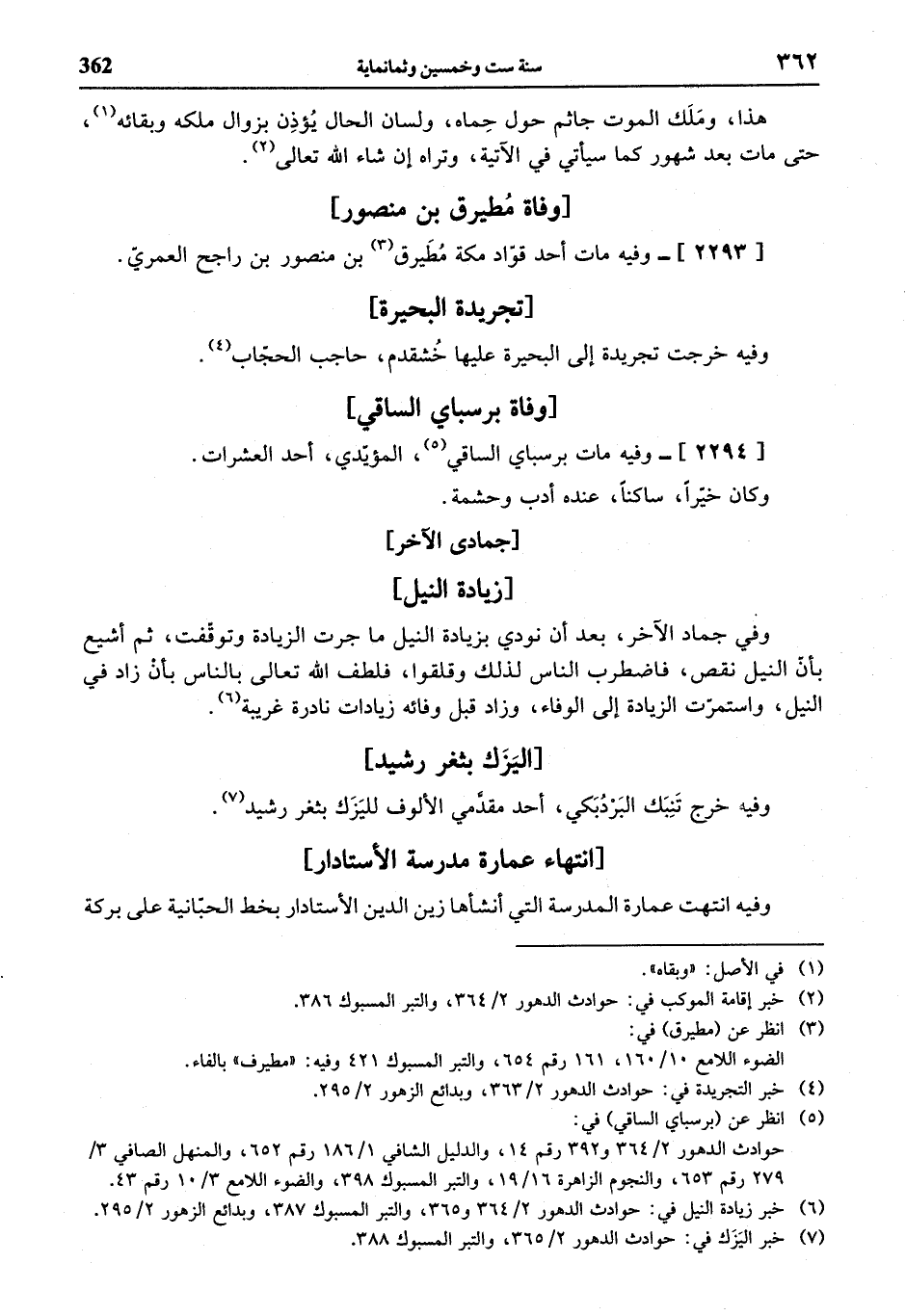 (¬6) خبر زيادة النيل في: حوادث الدهور 2/ 364 و 365، والتبر المسبوك 387، وبدائع الزهور 2/ 295.