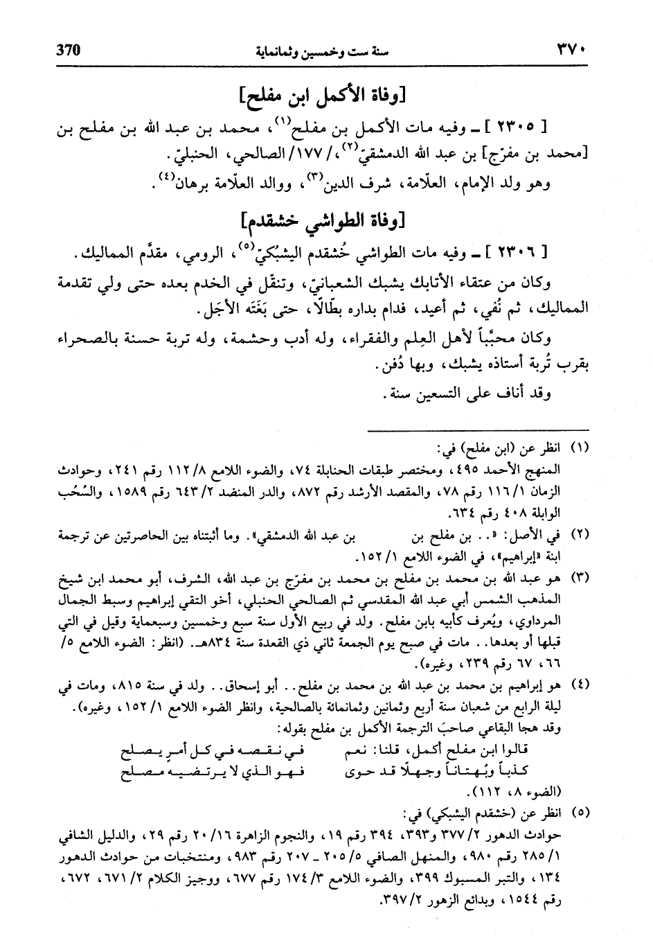 (¬1) انظر عن (ابن مفلح) في: المنهج الأحمد 495، ومختصر طبقات الحنابلة 74، والضوء اللامع 8/ 112 رقم 241، وحوادث الزمان 1/ 116 رقم 78، والمقصد الأرشد رقم 872، والدر المنضد 2/ 643 رقم 1589، والسحب الوابلة 408 رقم 634.
