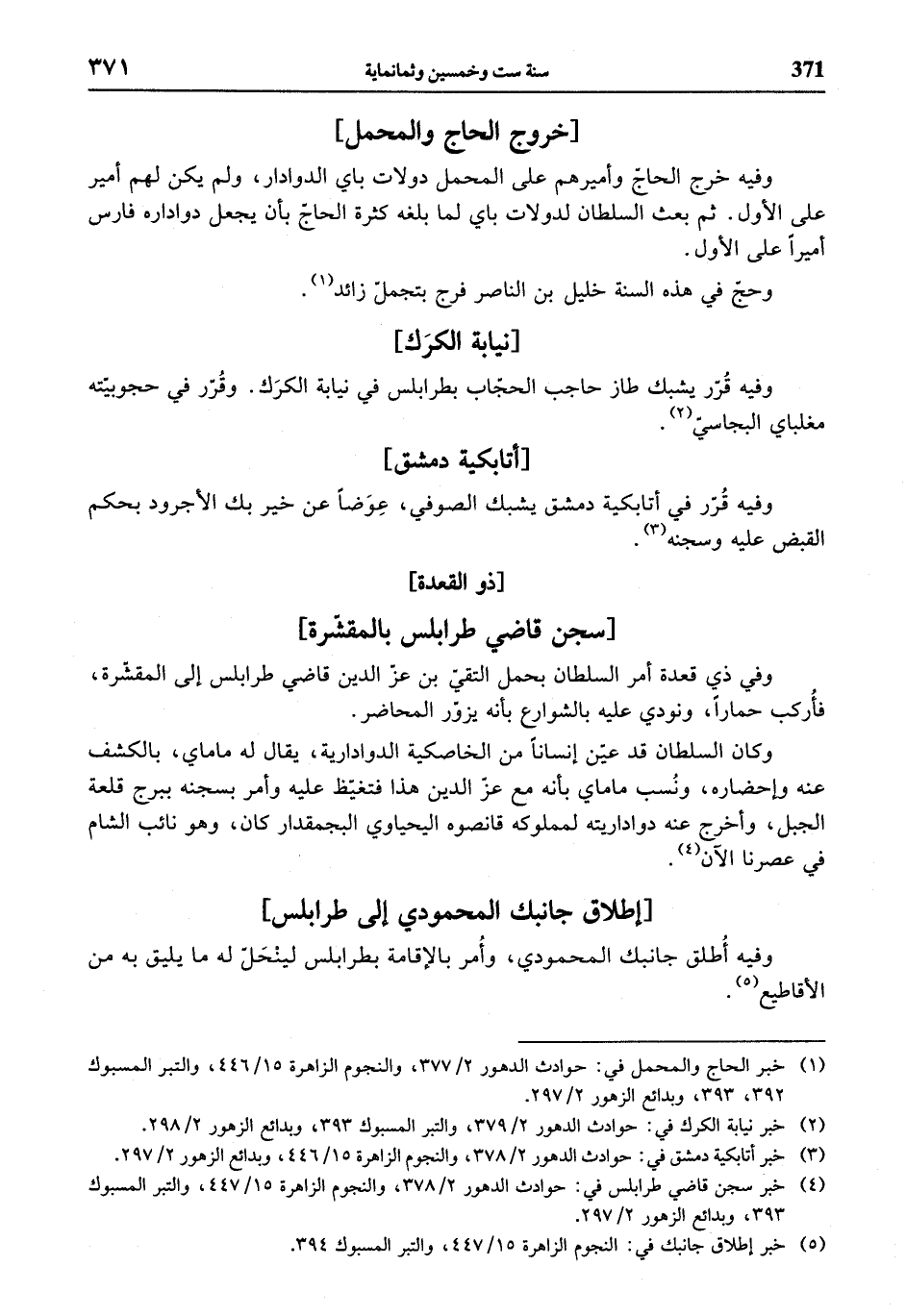 (¬4) خبر سجن قاضي طرابلس في: حوادث الدهور 2/ 378، والنجوم الزاهرة 15/ 447، والتبر المسبوك 393، وبدائع الزهور 2/ 297.