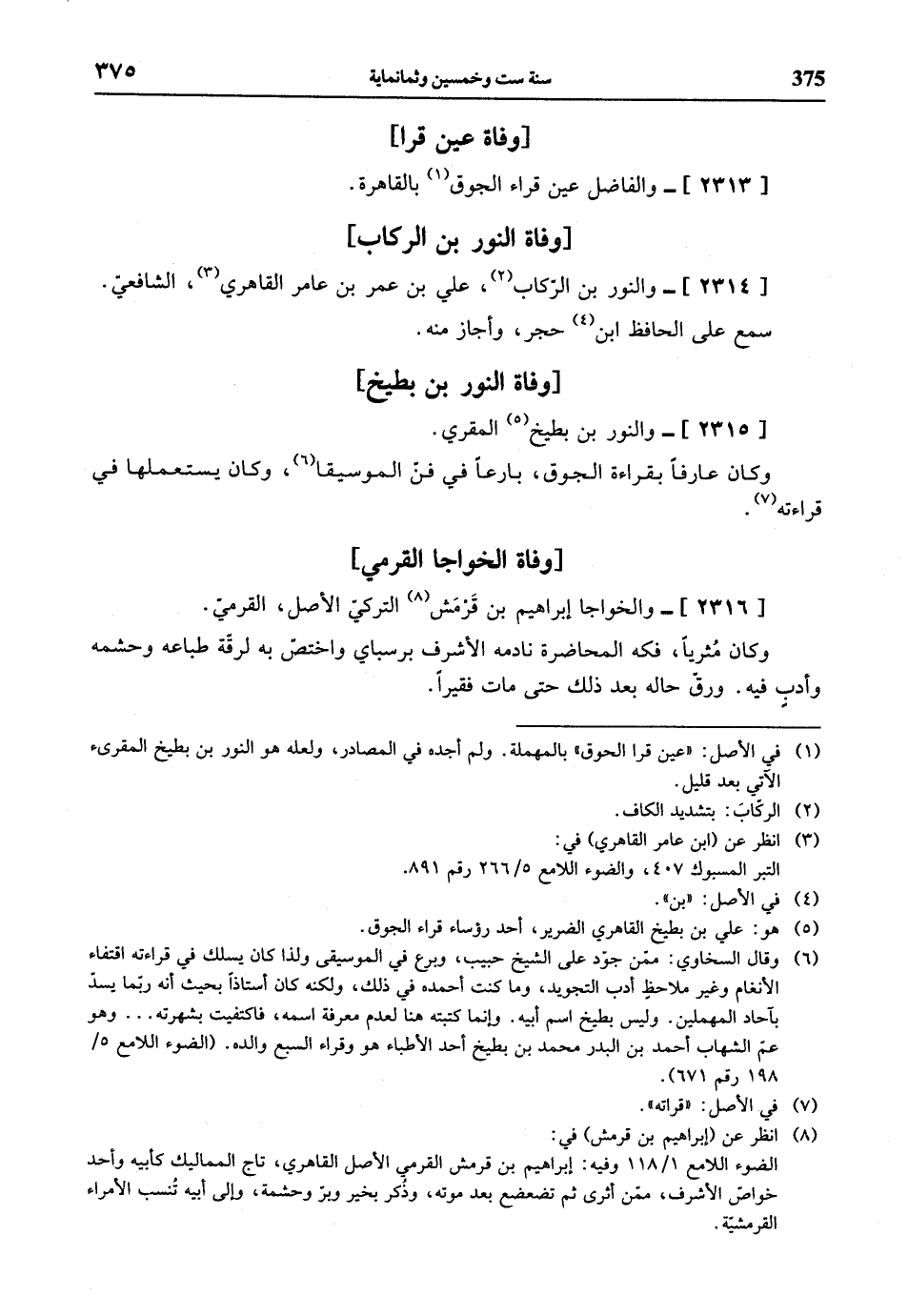 (¬6) وقال السخاوي: ممّن جوّد على الشيخ حبيب، وبرع في الموسيقى ولذا كان يسلك في قراءته اقتفاء الأنغام وغير ملاحظ أدب التجويد، وما كنت أحمده في ذلك، ولكنه كان أستاذا بحيث أنه ربّما يسدّ بآحاد المهملين. وليس بطيخ اسم أبيه. وإنما كتبته هنا لعدم معرفة اسمه، فاكتفيت بشهرته. . . وهو عمّ الشهاب أحمد بن البدر محمد بن بطيخ أحد الأطباء هو وقراء السبع والده. (الضوء اللامع 5/ 198 رقم 671).